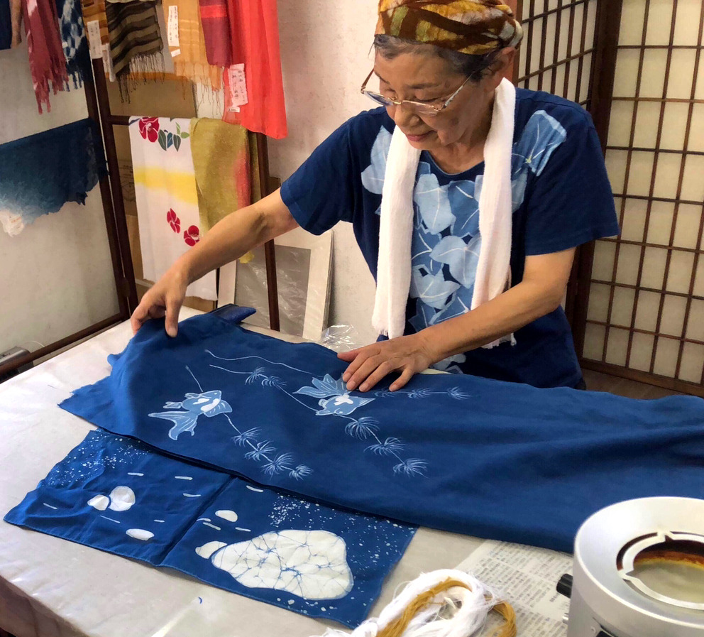 ローケツの技法で独自の模様を描くことができます。藍染の美しい色の変化もお楽しみください。