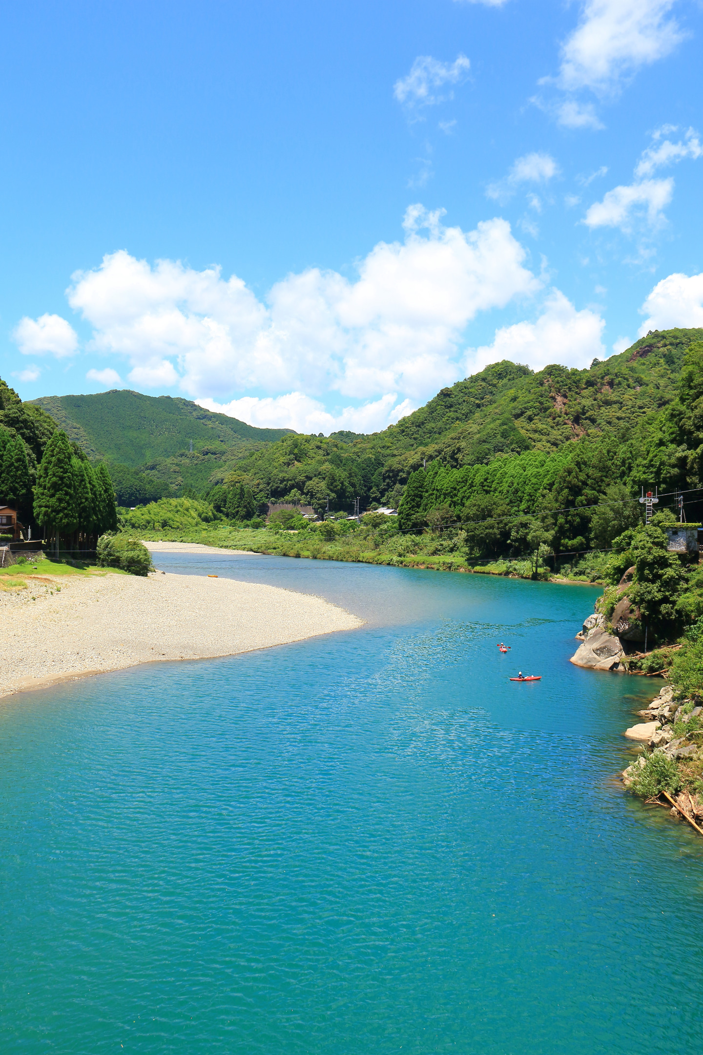 古座川町を南北に流れる清流「古座川」。水の透明度が高く、暑い季節には自転車を下りて水辺遊びもおすすめ。また、川沿いにはインスタ映えスポットが豊富にあります。