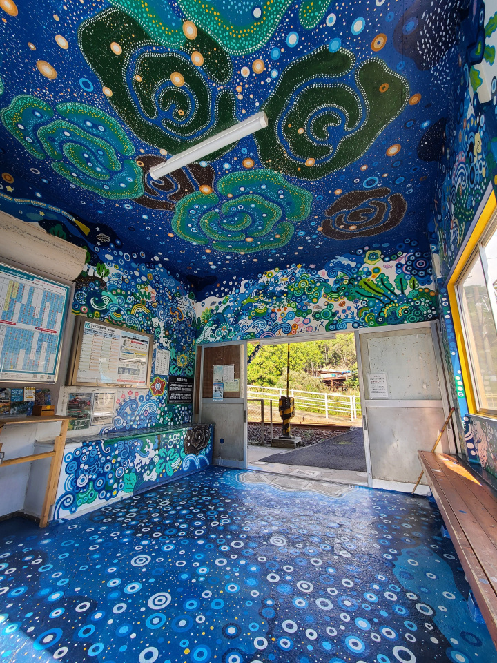 JR紀伊有田駅は、無人駅でどこかなつかしいノスタルジックな小さな駅舎。駅舎内に入ってみると全体が青色の世界にペインティングされていて、インスタ映えします。