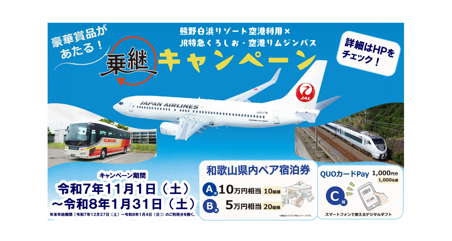 東京(羽田)⇔南紀白浜便のJAL便に搭乗した方や、同便に搭乗し、かつ同日中にJR特急「くろしお」または熊野御坊南海バスが運行する空港リムジンバスを利用した方に抽選で豪華賞品があたるキャンペーンを実施中!