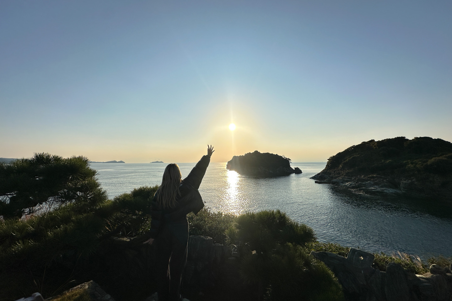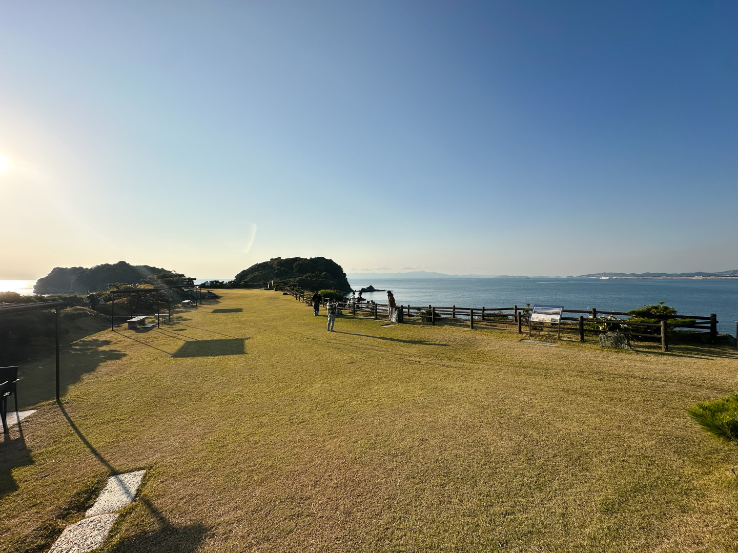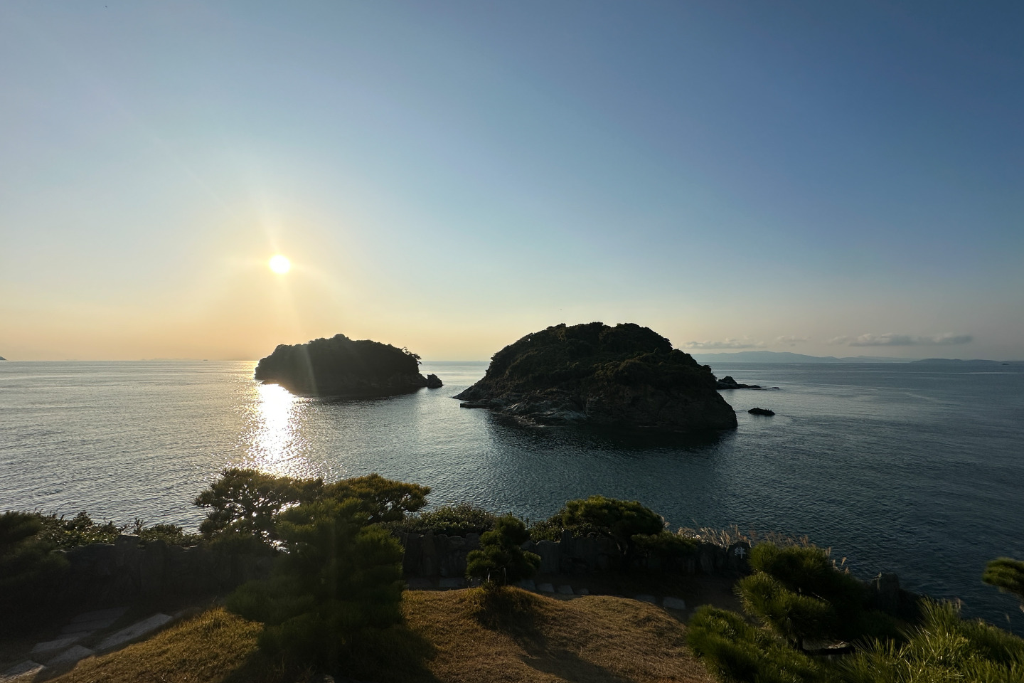 1960年に建てられた、崖の上に立つ白亜の「雑賀崎灯台」は、紀伊水道を行き交う船の道標として今も役割を担っています。展望台に上がると番所庭園を眼下に、晴れた日には淡路島や四国まで見渡せる雄大なパノラマが広がります。夕暮れどきには海へ沈む夕日を求めて多くの人が訪れ、特に日没前後のマジックアワーは格別。双子島や中ノ島、大島が点在する眺めも雑賀崎ならではです。階下の芝生広場には、四季ごとの日没位置を示す目印があり、ベンチでくつろぎながら景色を楽しめますよ。