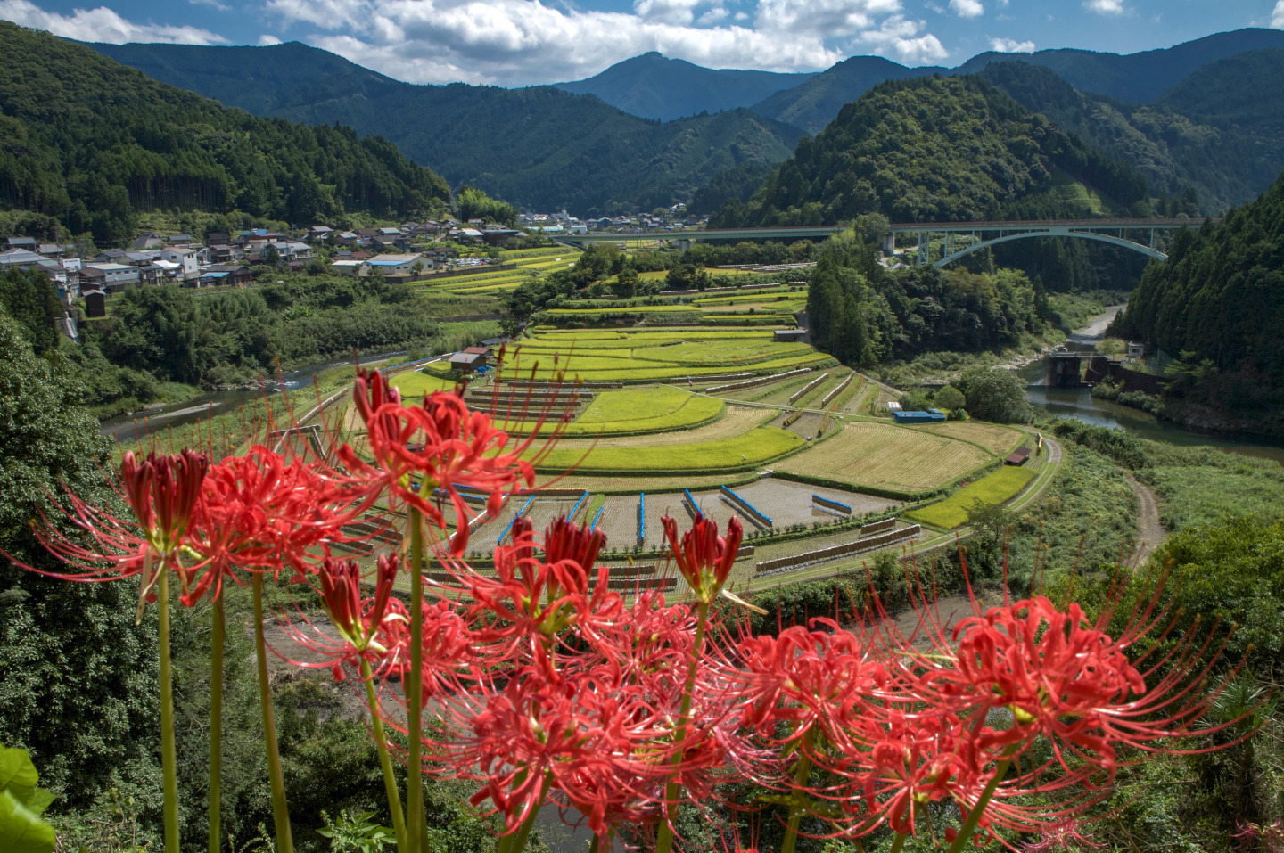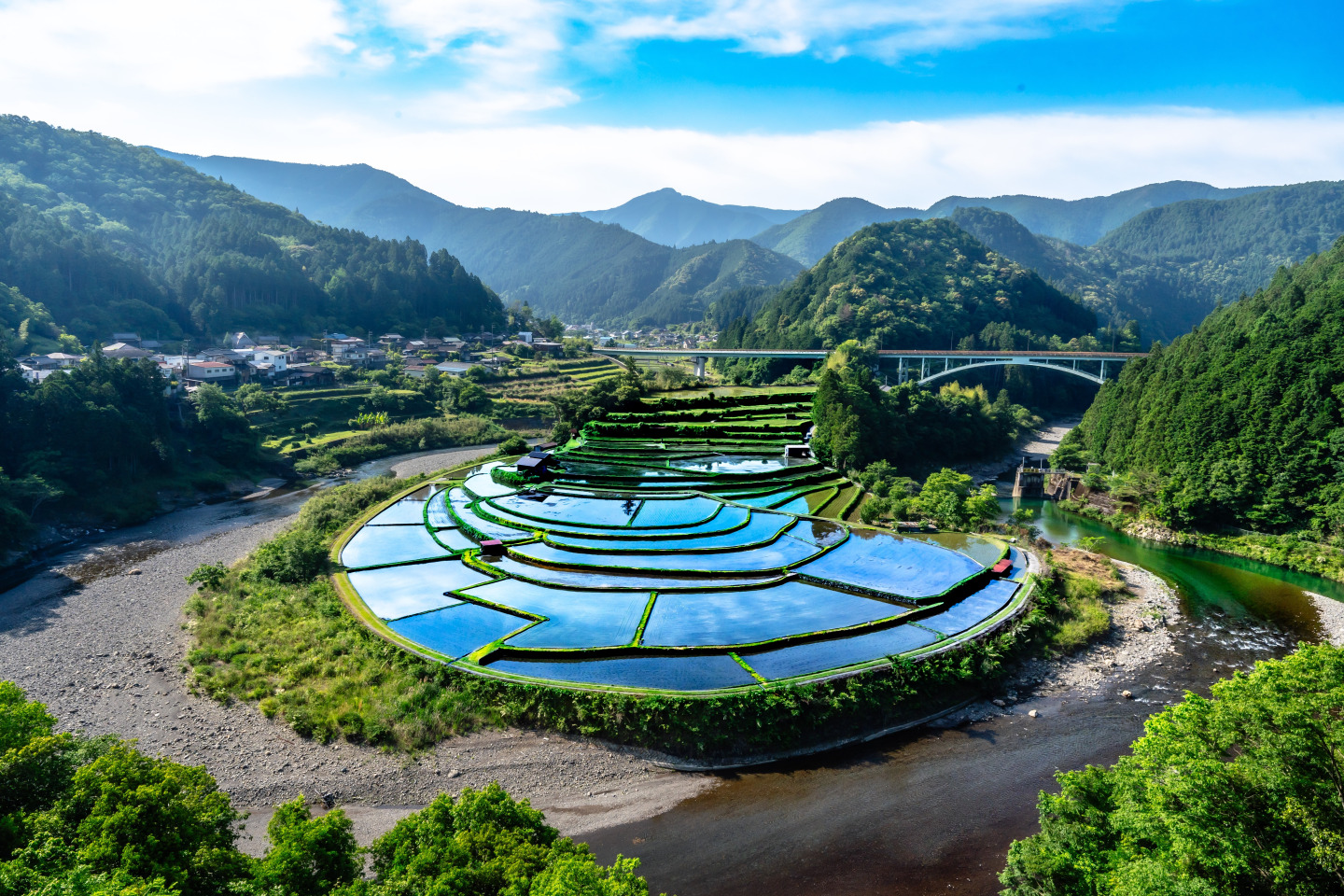 円を描くように広がる棚田の景観が美しい、和歌山を代表する絶景スポット「あらぎ島」。展望台からは、春の水鏡、夏の深緑、秋の黄金色、冬の雪景色と、季節ごとに表情を変える棚田を一望できます。その価値は高く評価され、「国の重要文化的景観」にも選定。写真好きにも人気のスポットです。近くには道の駅「あらぎの里」もあり、棚田の風景とあわせて、地元ならではの特産品や味覚を楽しめます。