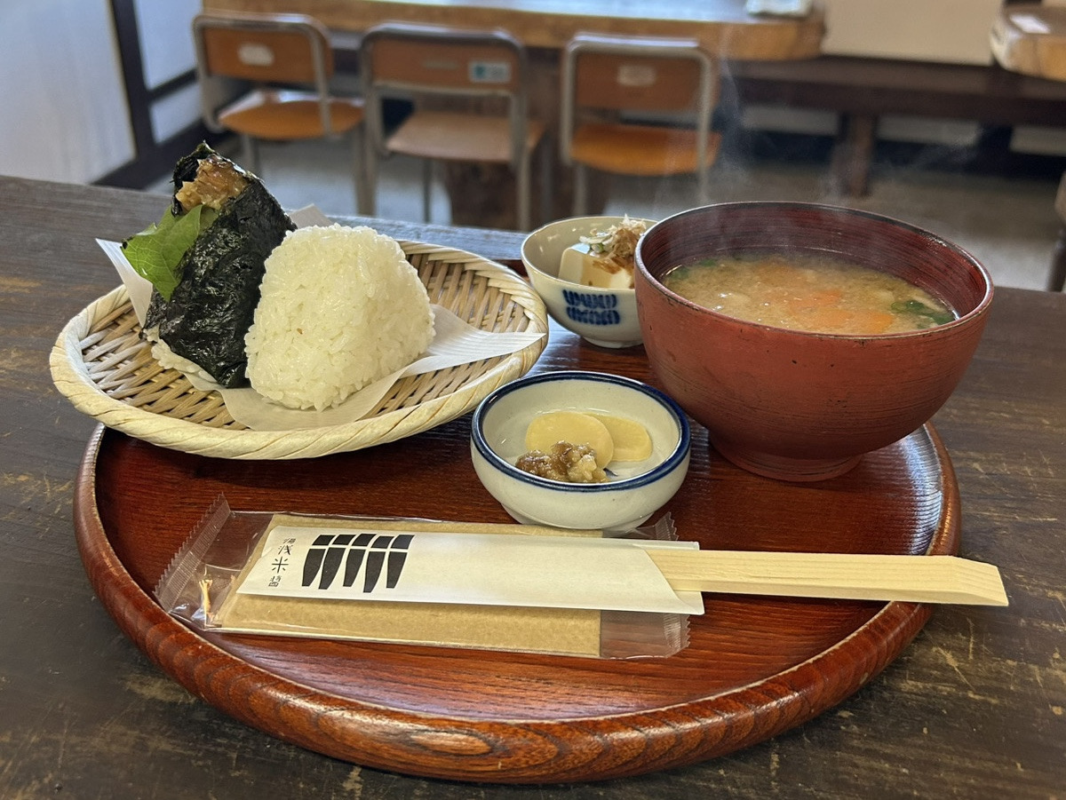 レトロな旧駅舎を活用した店内で、湯浅ならではの味を楽しめる「湯浅米醤(ゆあさべいしょう)」。かまど炊きのご飯で握るおむすびは、一粒一粒に艶が立ち、ふっくらとした仕上がりです。おすすめはおむすび定食。日替わりのおにぎり2個に味噌汁、小皿、漬物が付き、漬物皿には厚切りのたくあんと金山寺味噌も添えられます。素朴ながら土地の魅力が詰まった一膳です。