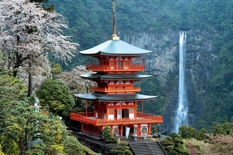 那智の浜から程なくの所にある、浜の宮王子・補陀洛山寺(ふだらくさんじ)を起点として、那智川に沿って熊野那智大社・青岸渡寺(せいがんとじ)へと向かいます。途中井関地区では山林の中を行く自然道となり、市野々王子(いちののおうじ)を経て古道はいよいよ熊野那智大社への参道である大門坂へ。樹齢八百年といわれる夫婦杉が長い道程の苦労をねぎらってくれます。見事な杉が立ち並ぶ大門坂の途中には、熊野九十九王子最後の王子社である「多富気王子(たふけおうじ )」があり、ここを過ぎれば程なくで、最終目的地である「熊野那智大社」「青岸渡寺」に到着。これまでの疲れも、熊野三山詣でを果たした心地よい達成感によって拭い去られることでしょう。