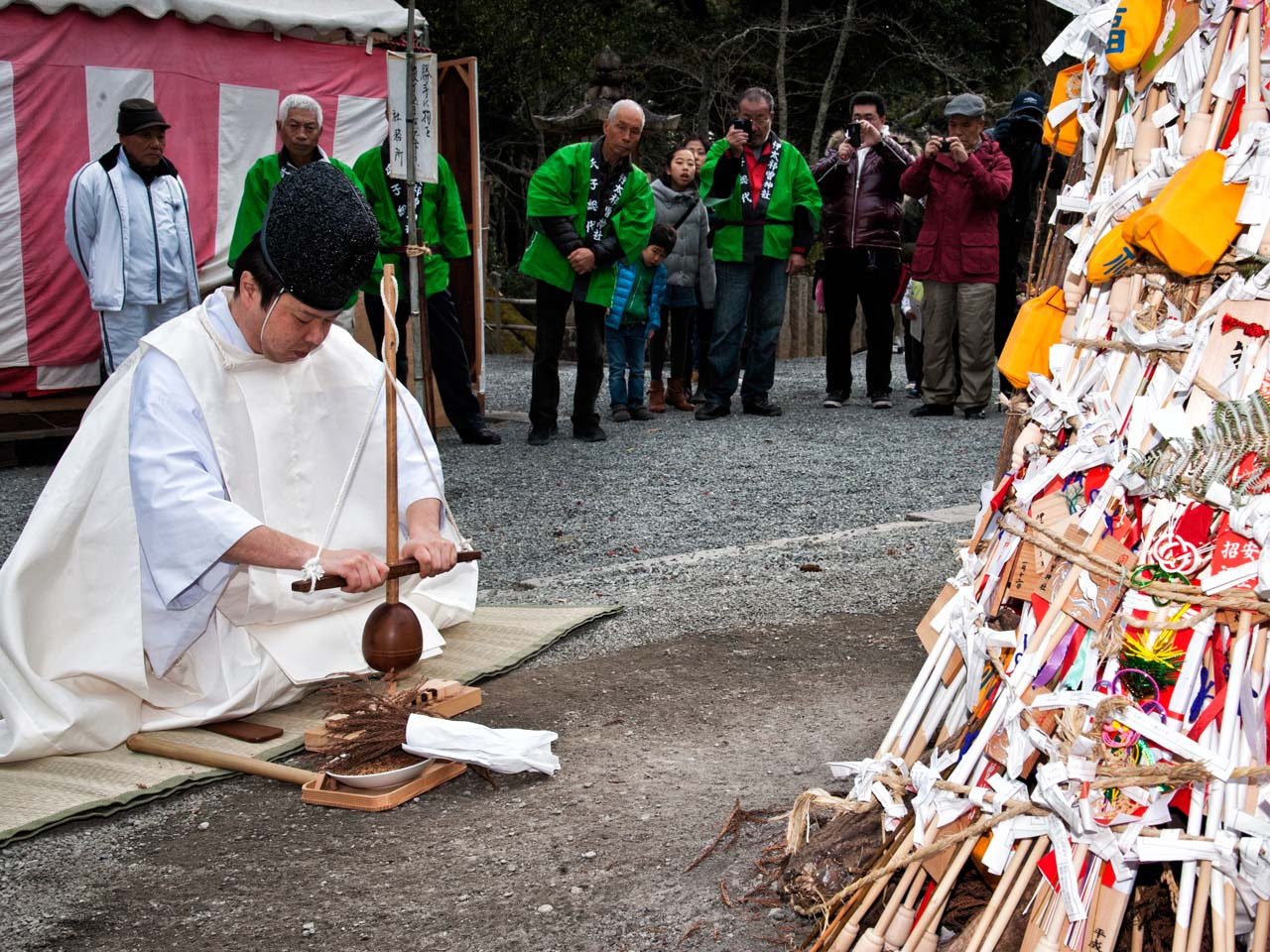 卯杖で邪気を祓うと伝えられる厄除の祭典。14日夜には小豆粥を炊き、その中に竹筒を沈めて、中に入った粥の量で、稲や農作物の豊凶を占います。この小豆粥は15日の祭典後に振舞われ、これを頂くと魔除けになり、無病息災になるといわれています。