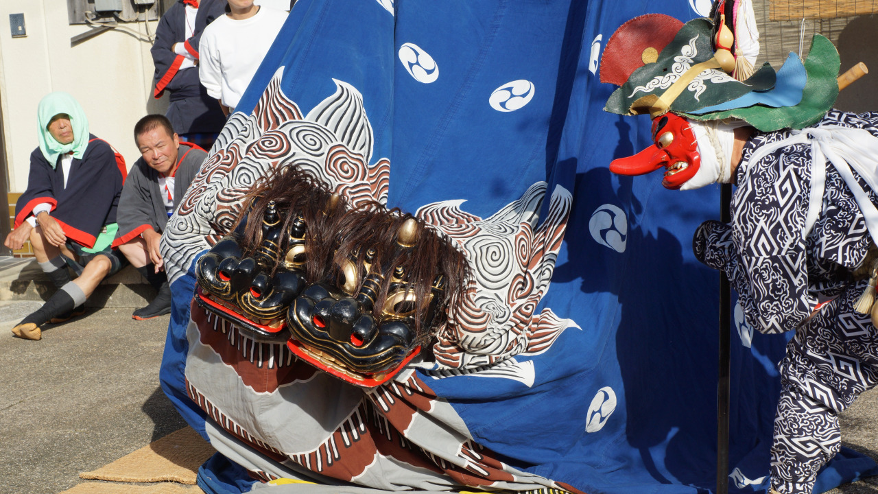 笛や太鼓の楽曲なしで雌雄の鬼の持つ矛(ほこ)と簓(ささら)の発する気配のみで踊る『双頭の踊り獅子』がある。
