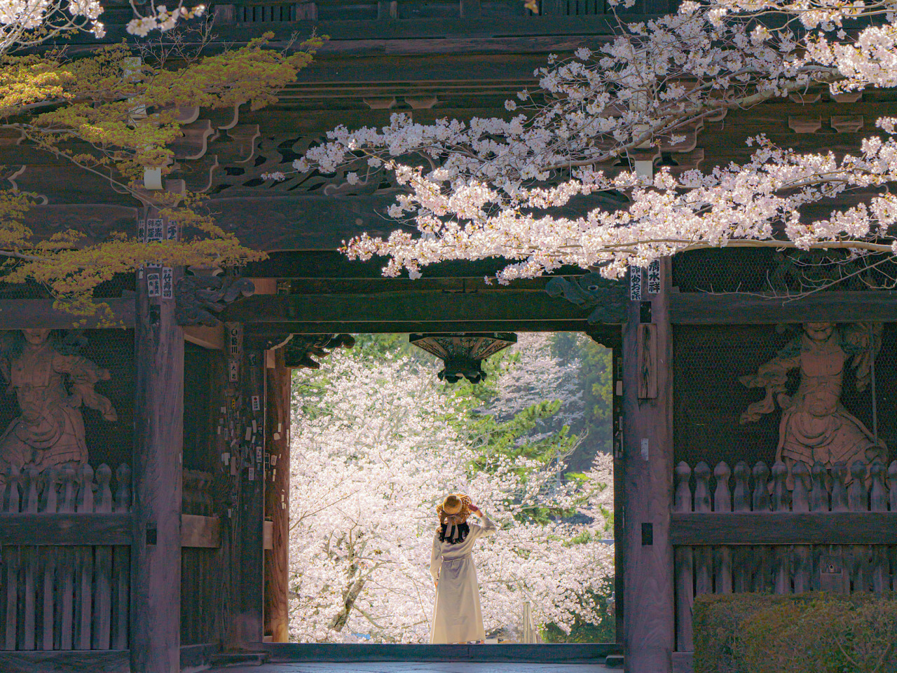 粉河寺は、鎌倉時代に七堂伽藍、550カ坊という広大な寺域を有した名刹です。広々とした境内には、石畳の参道や大小20有余の堂塔伽藍があります。中でも、国指定名勝の粉河寺庭園は、紀州の名石を含む多数の巨大な岩石がそびえ立ち、その壮観な佇まいは類を見ない迫力です。 春になると境内は桜やサツキの花で彩られ、石畳の参道や庭園に桜吹雪が降り注ぐ様はとても幻想的。