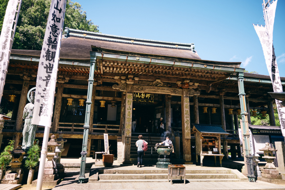 青岸渡寺本堂の後方には三重塔が建ち、那智の滝を望む景観も見えますよ。