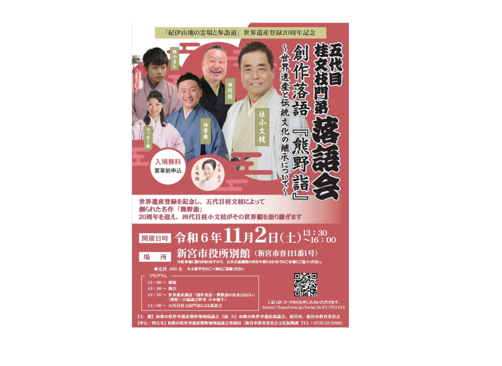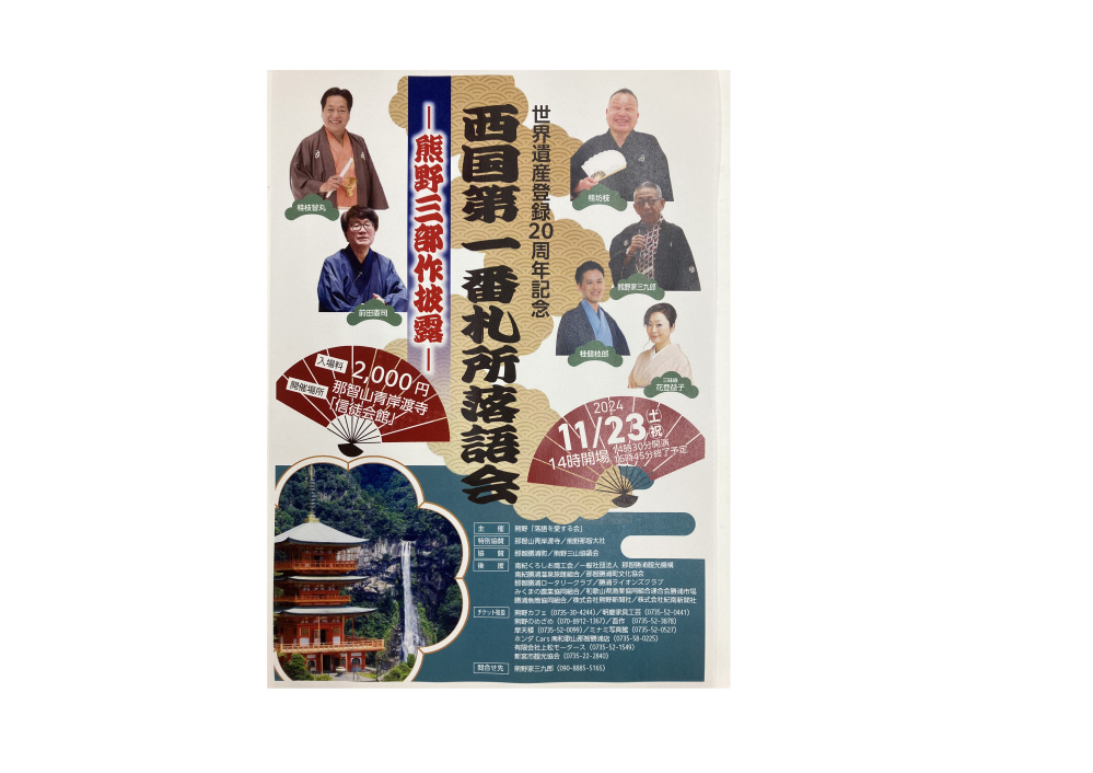 「紀伊山地の霊場と参詣道」世界遺産登録20周年をお祝いし、熊野をモチーフにした「熊野詣」「三枚起請」「宗珉の那智の滝」の落語三席を「熊野三部作」として、ここ世界遺産の地・那智山青岸渡寺にてご披露いたします。落語に見る熊野、どうぞお楽しみください。