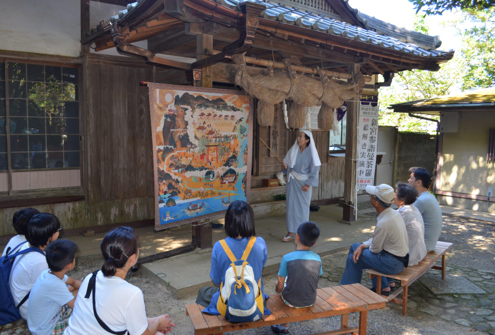 新宮市観光協会登録ガイドが比丘尼の装束で当時の熊野曼荼羅絵解きを再現し、解説後は新宮の世界遺産を巡るフィールドワーク付き。