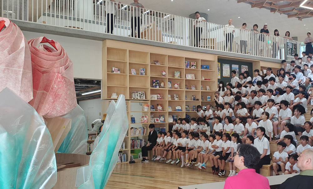 本作品は、和歌山県内の1万人以上の小中学生が参加し、自らの願いが他者に与える影響を考えて2cm角の高野紙に書き、台座に貼り付けた。さらに子どもたちの感性を生かした香りが空間を包み、蓮華の開閉と香りを通じて「利他のこころ」が世界へ広がり、人と自然を結びつける姿を表現している。