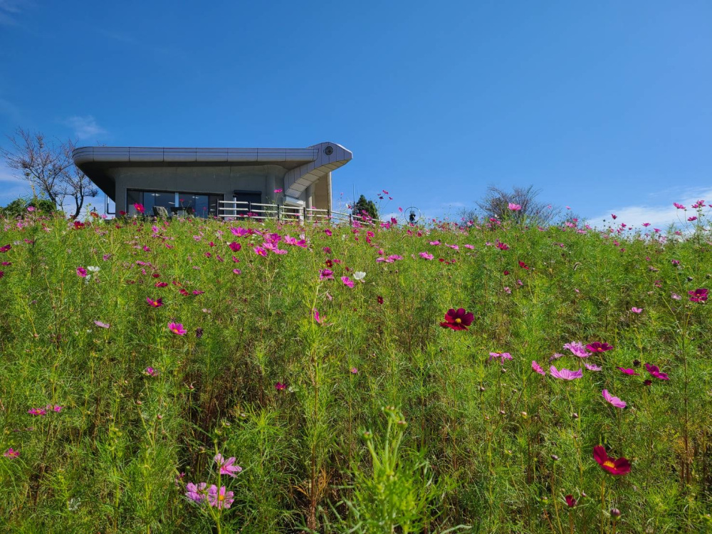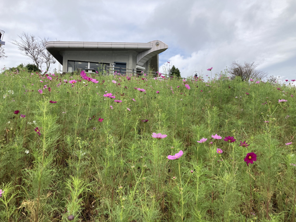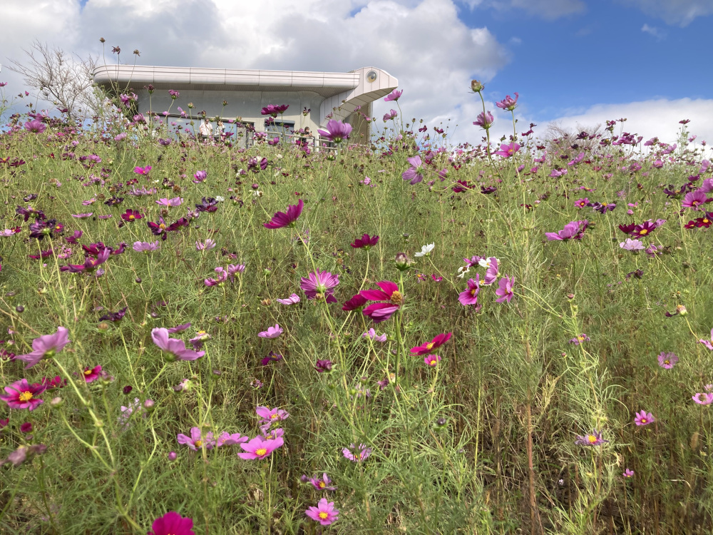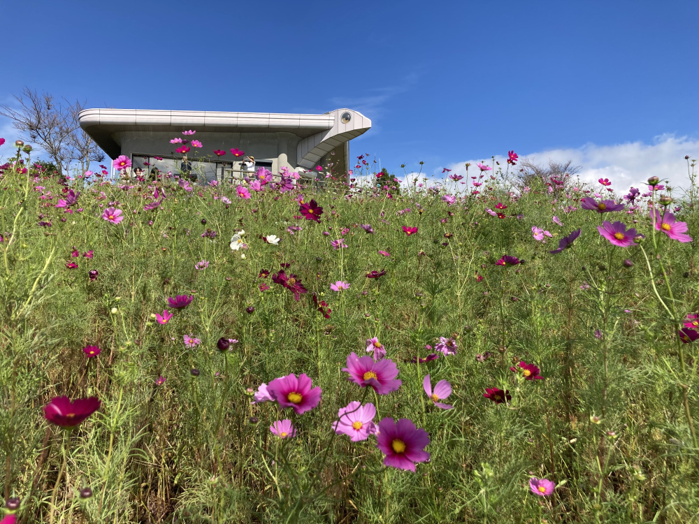 コスモスパークの名のとおり、秋には辺り一面にコスモスが咲き、心地よい風が吹き抜けます。