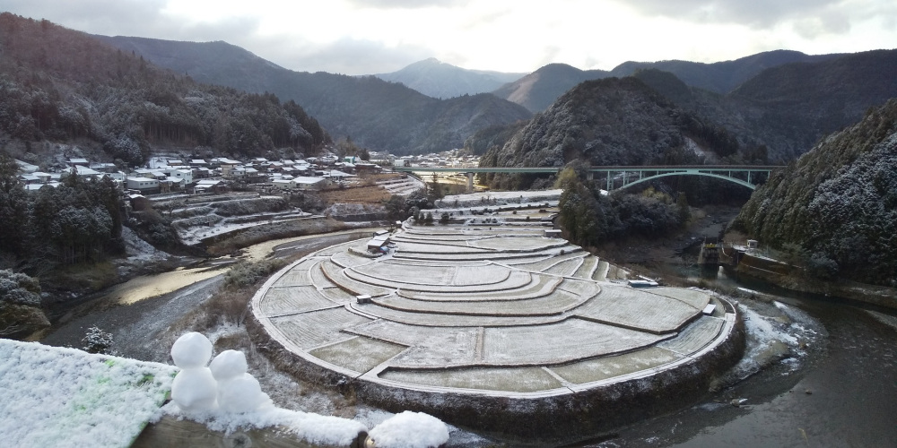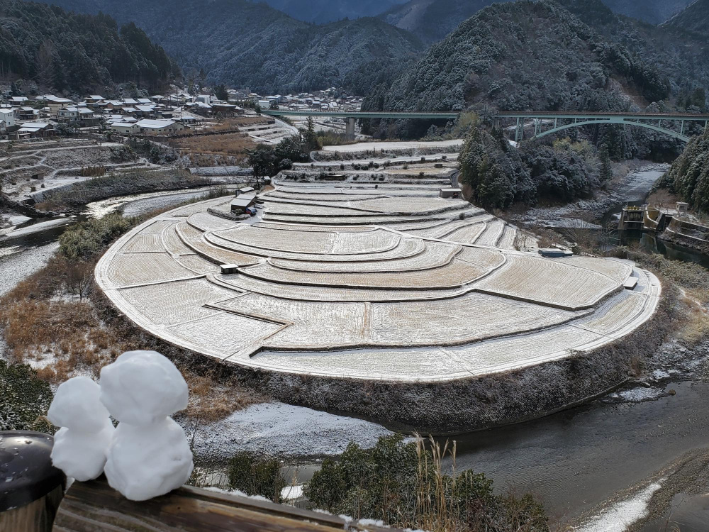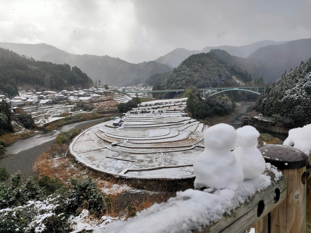 今年度最強の寒波がやってきて、あらぎ島もほんのり雪化粧しています。あらぎ島の展望所には小さい雪だるまがたくさん並び、雪の景色を楽しんでいるようです。