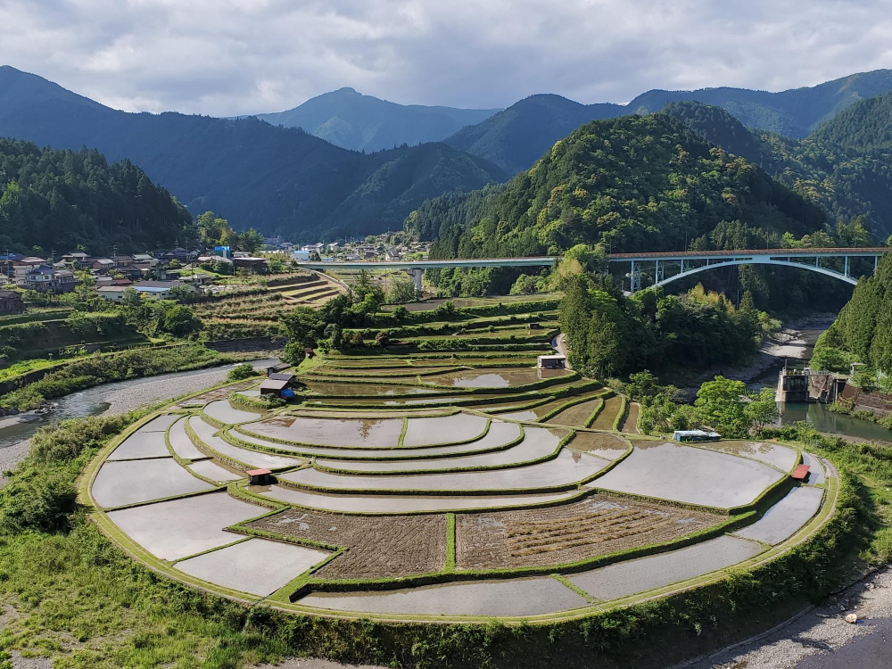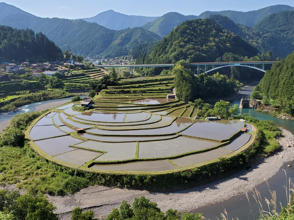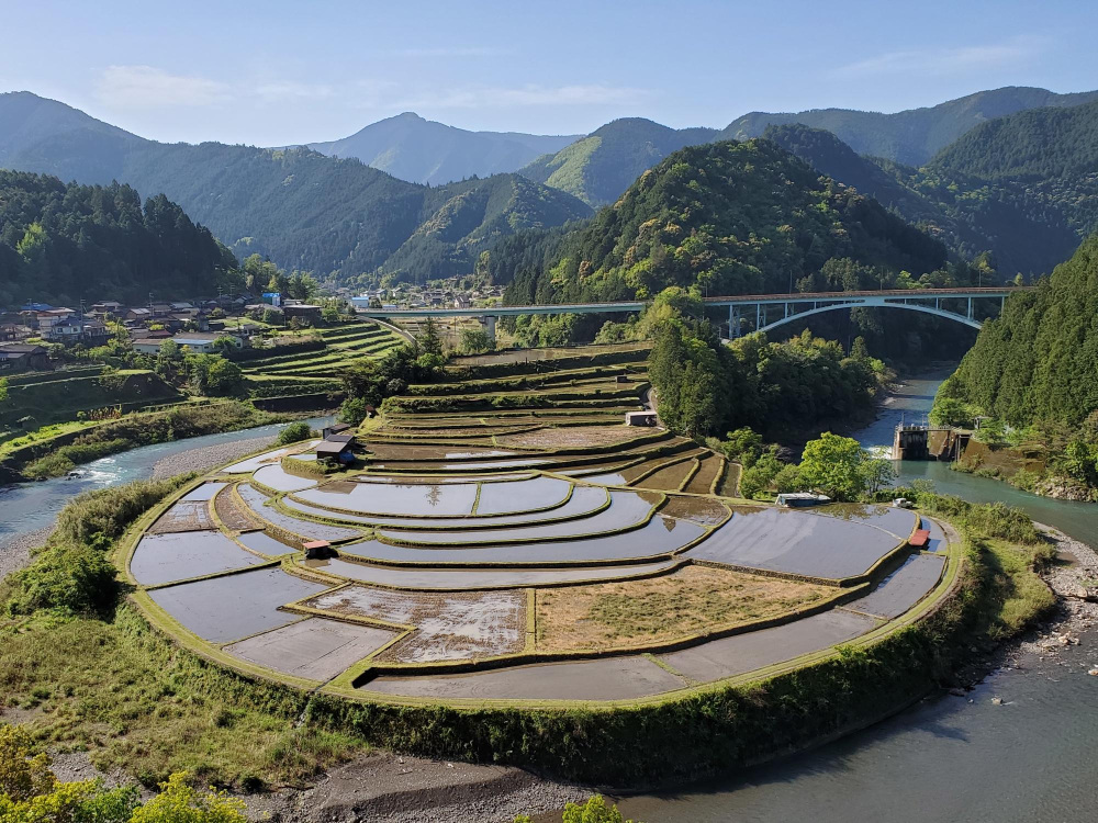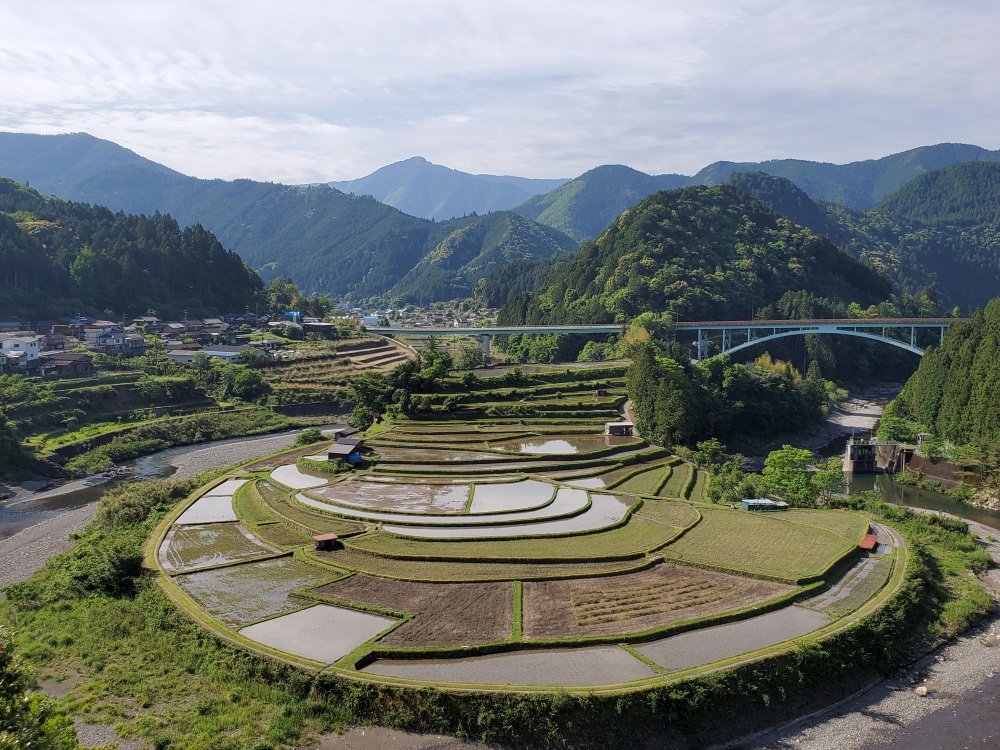 ほとんどの田に水がはられています。緊急事態宣言が解除されましたが、県をまたぐ移動の自粛要請が出されておりますので、有田川町のホームページやSNSであらぎ島の風景をご覧ください。