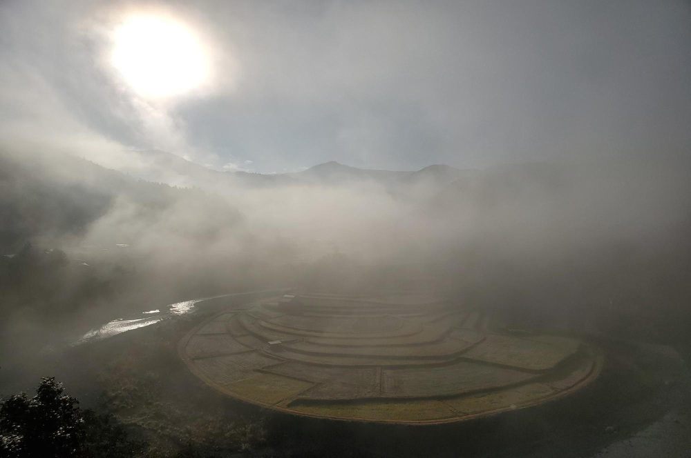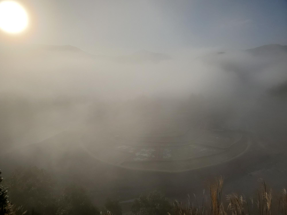 今朝は暖かかったため、清水地域には霧が発生していました。あらぎ島周辺も幻想的な風景が広がっていました。