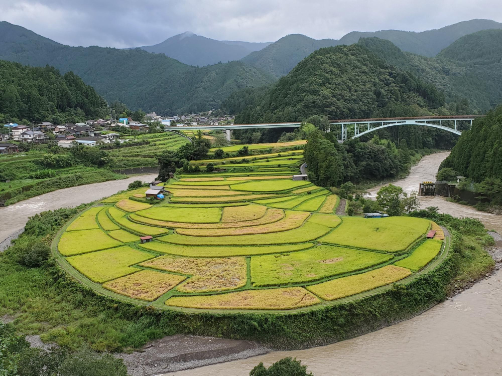 撮影のあらぎ島。稲刈りが始まっています(写真上段付近)。