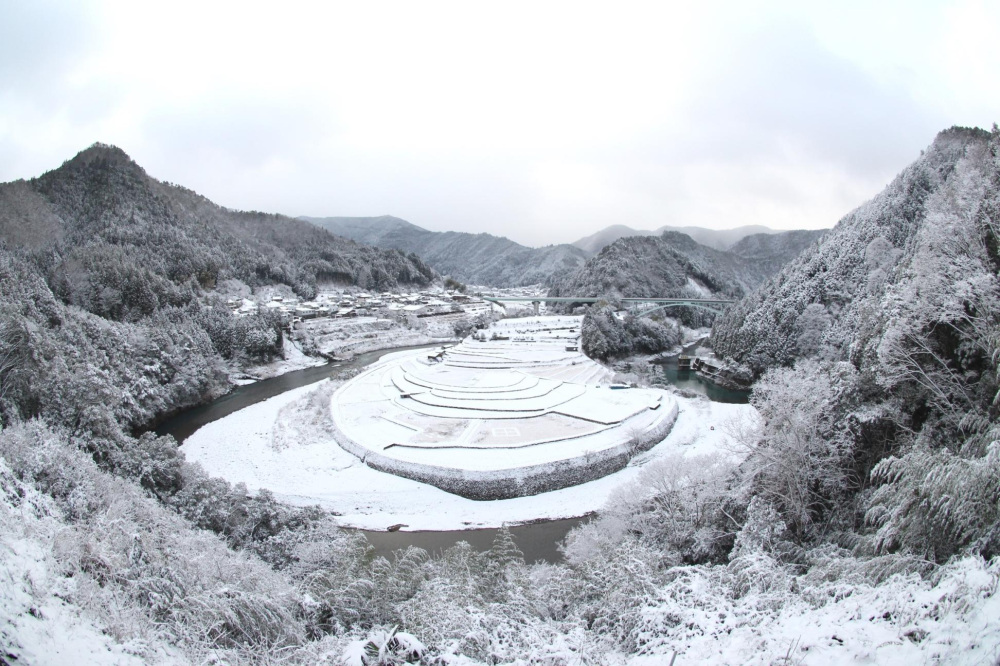 24日から、10年に一度レベルの寒波が訪れ、あらぎ島周辺でも20~30センチメートルの積雪がありました。あらぎ島も真っ白に雪化粧。差し込む陽光できらきらと輝きます。