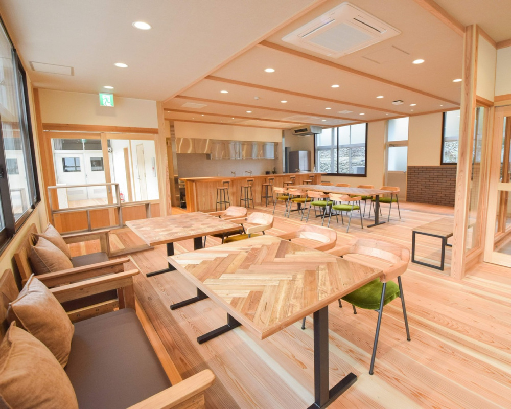 旧小学校をリノベーションした「しろにし」。シェアハウス・ドミトリー・ランドリーカフェを備えた複合型施設です。紀州材をふんだんに使用し、温かみが感じられる内装です。二段ベッドやロッカー、机、椅子などの家具は有田川町内の家具職人が作ったものだとか!