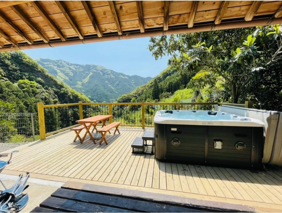 生石高原の麓にあるゲストハウス。山々の絶景を見渡すテラスと屋外ジャグジーが自慢です。