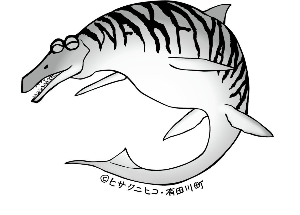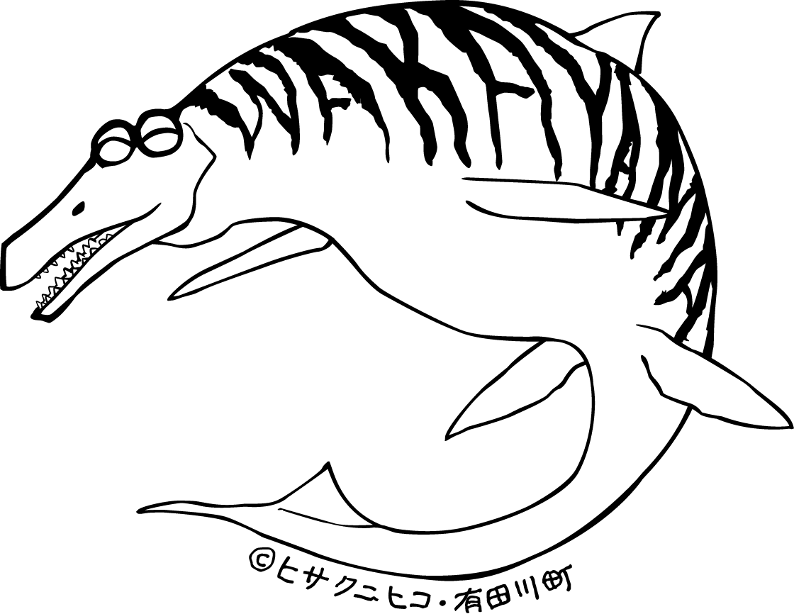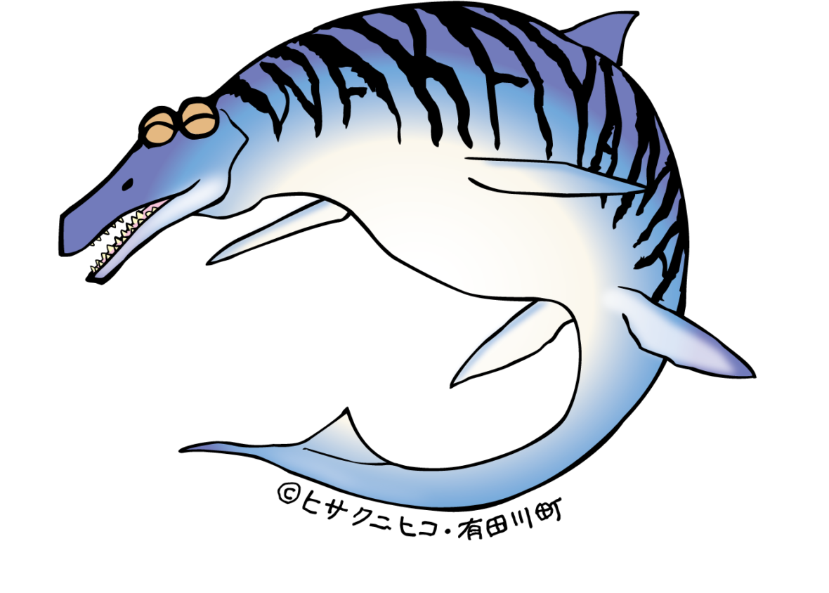ワカヤマソウリュウとは、平成18年に有田川町の鳥屋城山で発見されたモササウルスの通称です。令和5年12月に新種と認定されました。大きな脚ひれ・前向きの眼・背びれが特徴で、背びれがあるモササウルスが発見されたのは世界初となります。