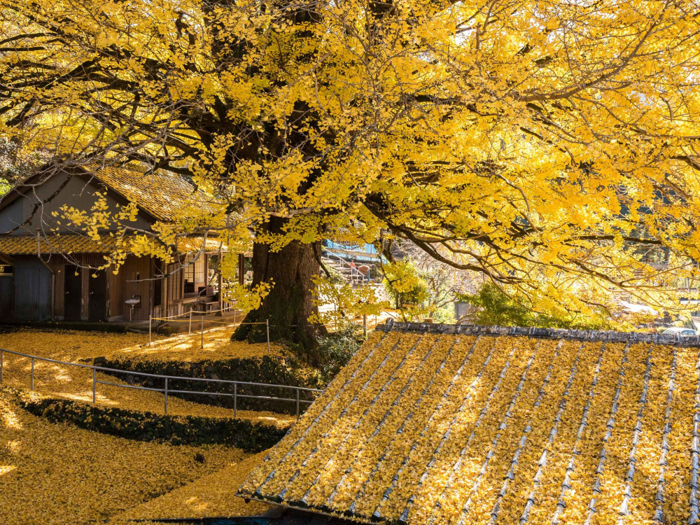 樹齢は400年以上と伝えられる、別名「千本銀杏」。秋の紅葉シーズンには黄金色に染まります。