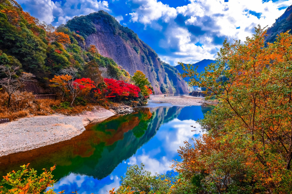 奇岩や大小さまざまな滝が点在し、 秋になると渓谷全体が鮮やかな紅葉に包まれ、川面に映る赤や黄色のコントラストが見事です。