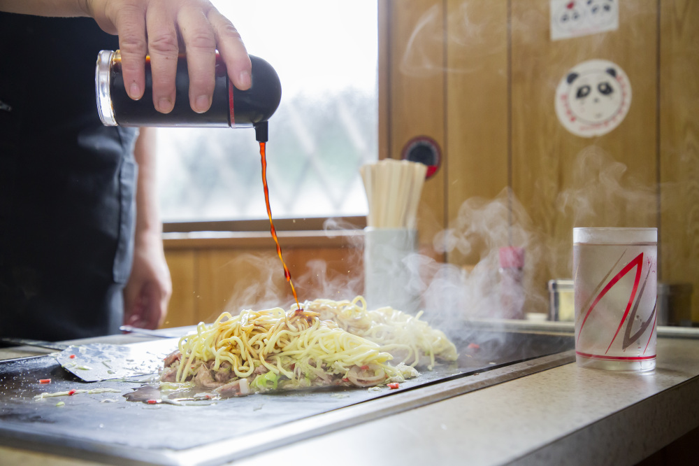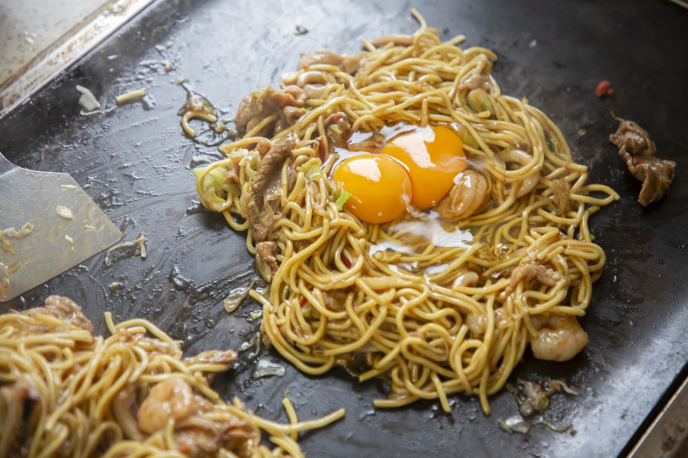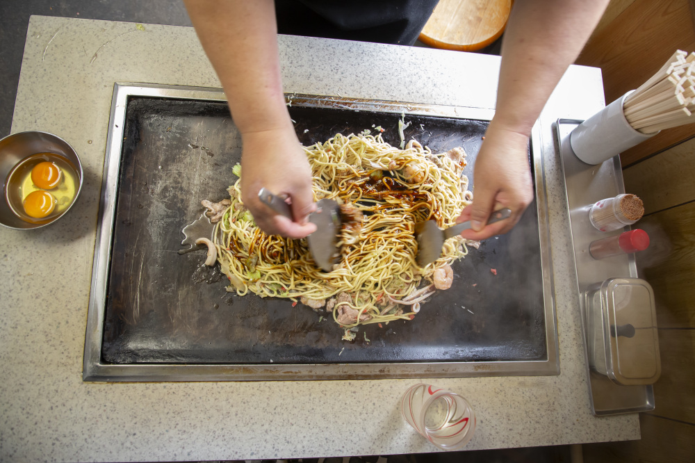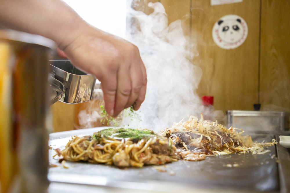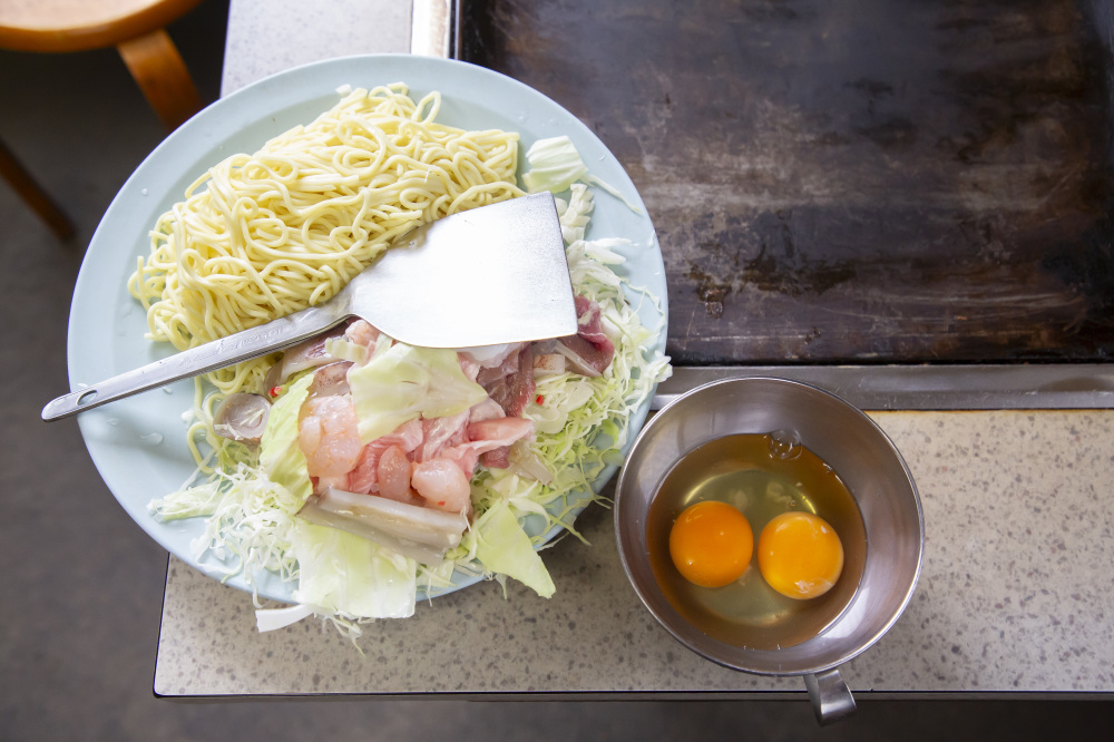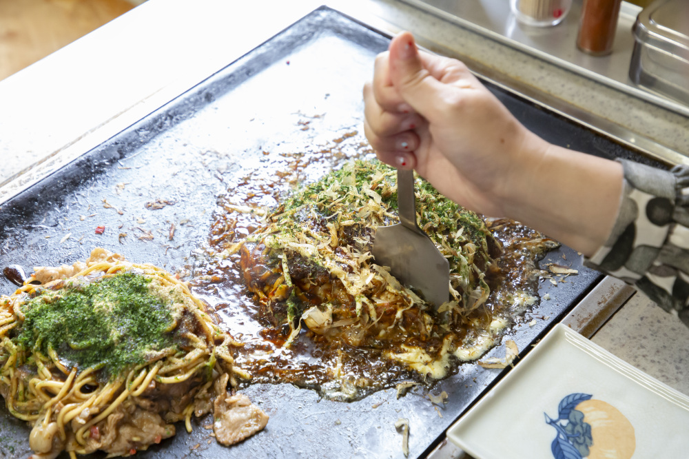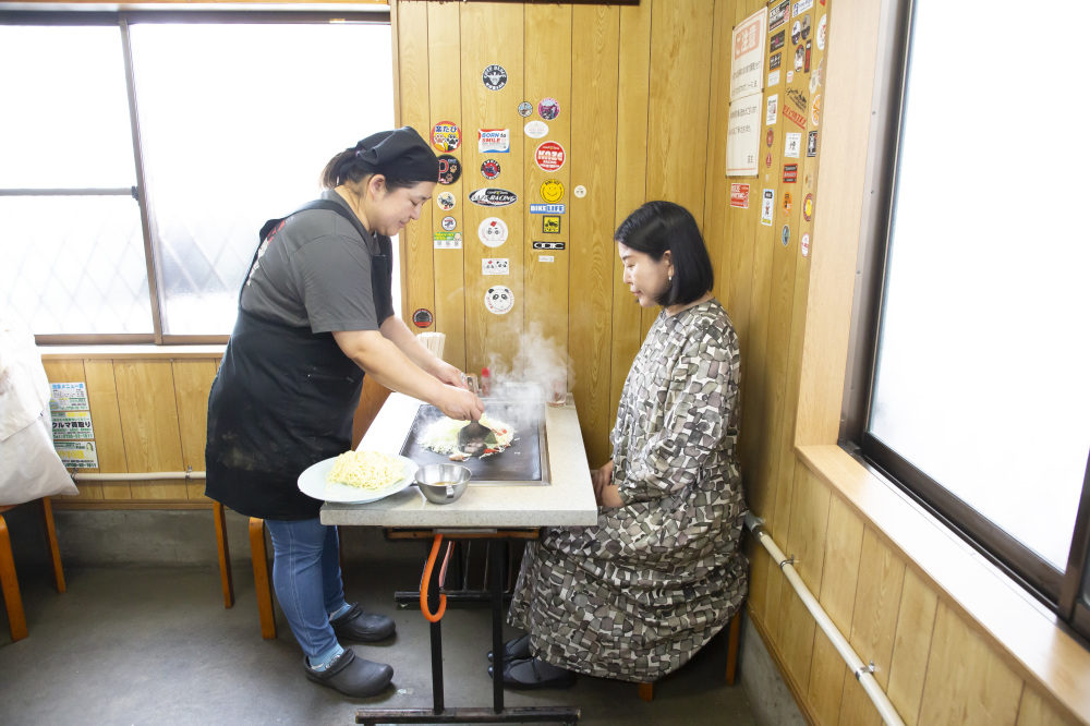 現在、店を切り盛りするのは、夏子さんの娘である2代目と、夏子さんの孫の3代目。2代目によると、「ガスがない頃は練炭を使って焼いていました。私は幼稚園の頃から駆り出されて、母の後ろでうちわを仰いでいました」。あらためて作り方を尋ねると「最初は焼きそばを焼いて、途中から焼きそばと卵をせちごうていきます。粉の入っていないお好み焼きなんです」。目の前で作ってくださるのをじっと見ていると、途中までは見た目が焼きそばだったのが、完成時にはお好み焼きの姿になっているのもそんなわけです。