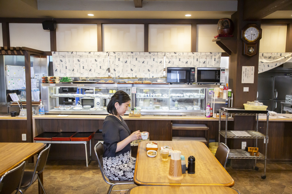 カウンターに並ぶさまざまな惣菜を、客それぞれがセルフで席に運ぶ昭和の食堂スタイルを今でも貫いています。