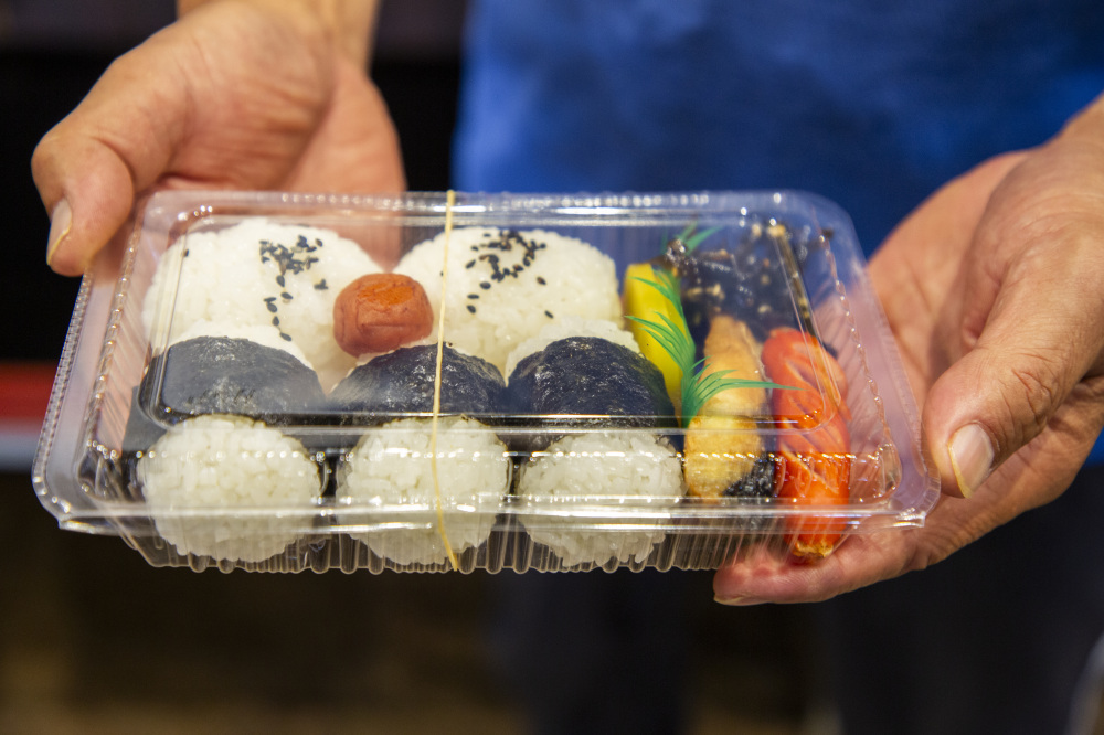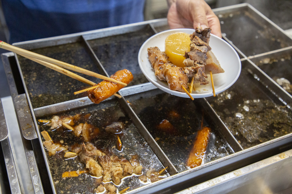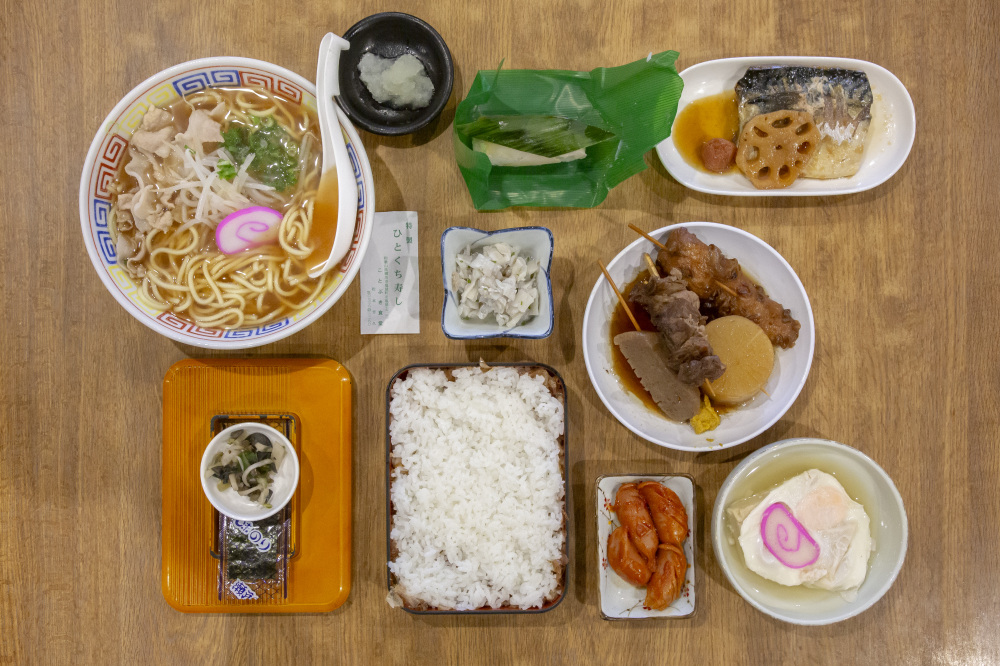 人気メニューを尋ねると「ウインナーとケチャップと甘辛く炒めたのや、魚肉ハンバーグ」とのこと。一つずつ大将が作る鯖寿司「ひとくち寿し」も、山盛りで用意してもいつのまにか完売に。すじ肉や生芋のこんにゃくなどを鶏ガラのだしで炊いたおでんや、昔ながらの鶏ガラ醤油だしを使った懐かしい味わいの「中華そば」も根強いファンがついています。釣り客が片手でも食べやすい「磯釣り弁当」は、俵形のおむすびが5個入って450円。毎日通う人もいるので、味噌汁の具を変えるという温かな心配り。車で移動する人だけでなく、ご近所さんの拠り所でもあるのです。