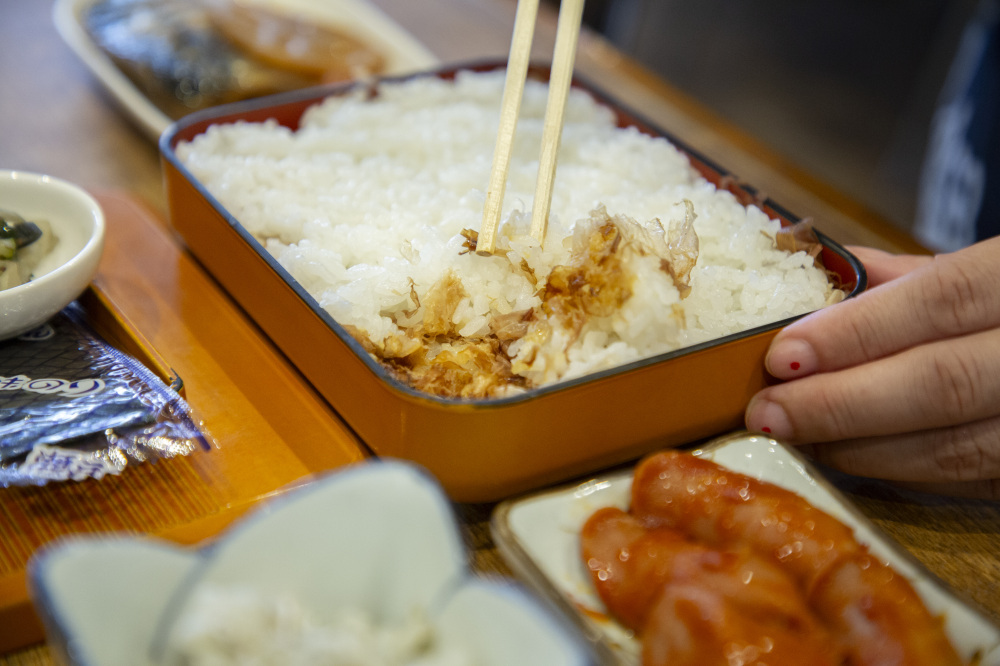 個人的に噂に聞いて食べてみたかったのが「ねこ飯」。その正体は、お客さんから頼まれて始めたおかかご飯です。重箱に詰めたご飯の間におかかを挟んで、たっぷりのボリューム。一人で好きなものを存分に味わうのもいいし、家族や仲間内でシェアしても。繰り返し通いたくなる食堂です。