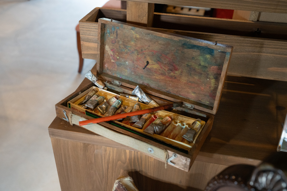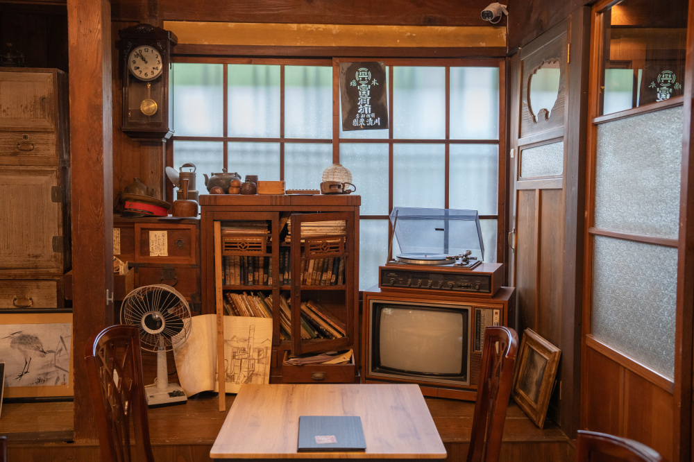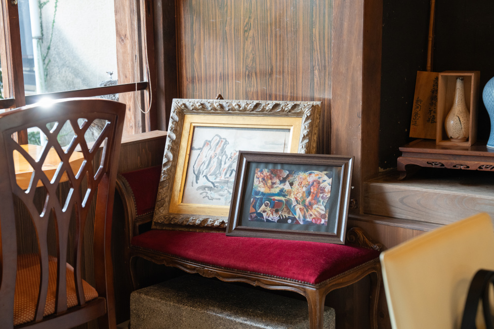 そんな軌外が生活と創作の場とした古民家をリノベーションしてカフェレストランにしたのが「庵堂」。1916(大正5)年に建てられた趣ある建物は、国の登録有形文化財に指定されています。店内で使用・展示される和箪笥などの家具や昔懐かしい家電、生活道具や古い書物は、明治、大正、昭和にかけて、家屋に残されていたものをそのまま使用しています。ところどころに飾られている絵画のほとんどは、軌外自身や軌外の息子の作品となんとも贅沢な空間です。