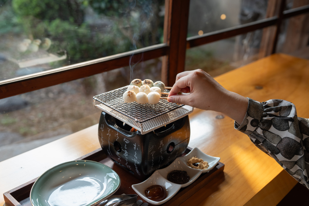 一番人気のメニューは、3本のだんごに3種類の具材がついた「焼きだんご」のセット。和歌山市の和菓子店がつくるだんご、和歌山産の醤油で作るみたらしあん、北海道産十勝小豆の粒あん、きな粉黒蜜と、味わいも豊か。自分でコンロで焼くひと手間を客それぞれが楽しんでいます。高野山名物の「焼きもち」や、かつらぎ町のパン職人が特別に焼くパンに特製あんをのせた「庵堂のあんバタートースト」も、コンロ焼きで仕上げます。「手ごねハンバーグの釜煮込み」や生パスタと食事メニュー、チーズケーキなどの洋風デザートも取り揃い、選択肢が多くあるのも嬉しいところ。川口果樹園による10種類以上の果実が実る果樹園を通るアプローチもステキです。
