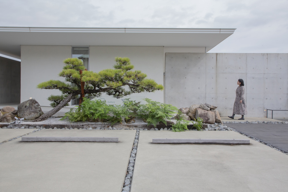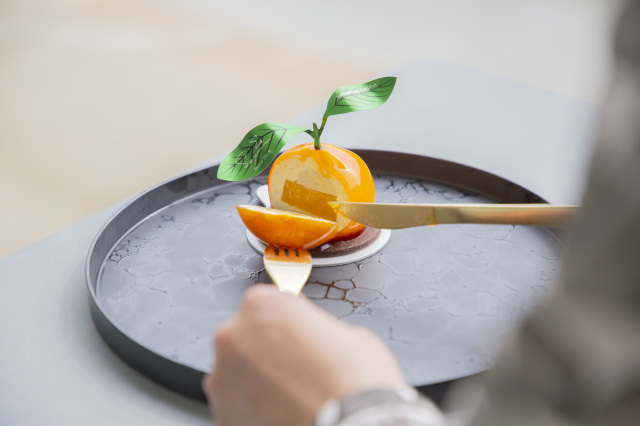 個人的には、「亀ちゃんの蜜柑」「気高き王様」「濃い恋バニラ」というような、詩的なお菓子のネーミングにも強く惹かれます。「祖父は亀三郎というんですけど、地域の人には“亀ちゃん”と親しまれていて。もともとこの店がある場所は、祖父のみかん畑だったんです。ミカンのジュレとブリュレをバニラムースで包んだ、このミカン形のケーキは、祖父への親しみを込めて名づけました」と貴之さん。「自然豊かな有田で生まれ育ちましたが、木の温もり以上に石の冷たさが好きだったので、自分の店を作る前にいろいろな美術館を見に行って、コンクリートや漆喰を使った建物を完成させました。みなさん生菓子にはセンスを求めていらっしゃると思うんです。お菓子や建築を作品として楽しんでいただけるように、パティスリーではなくギャラリーと名づけました」ともお話しいただきました。
