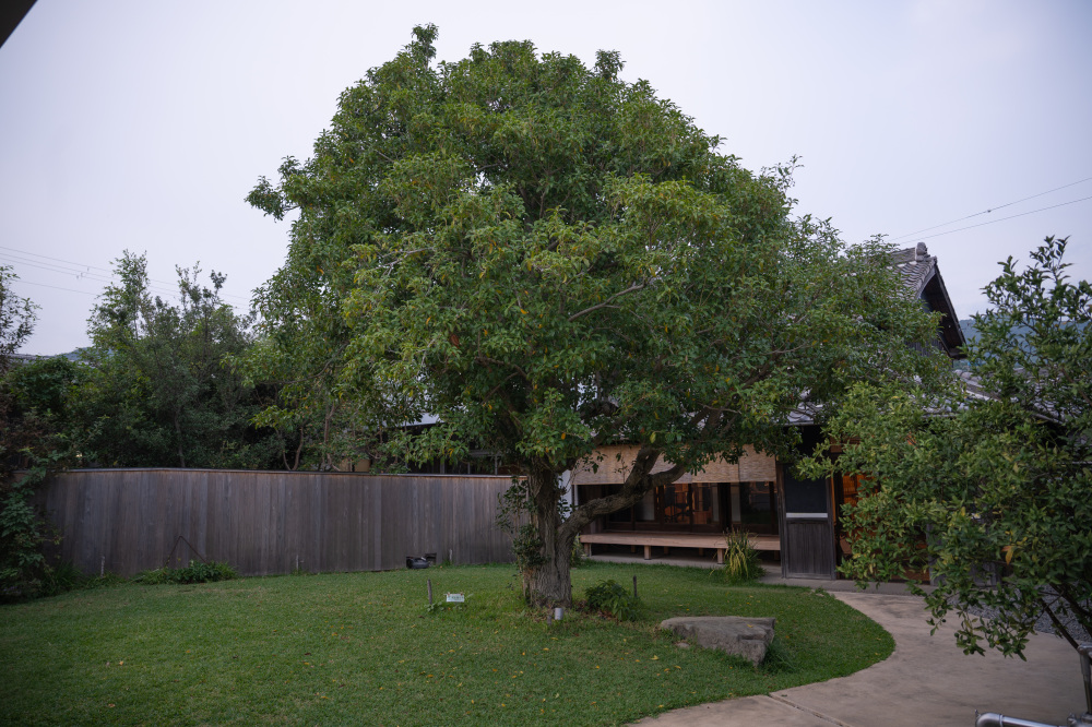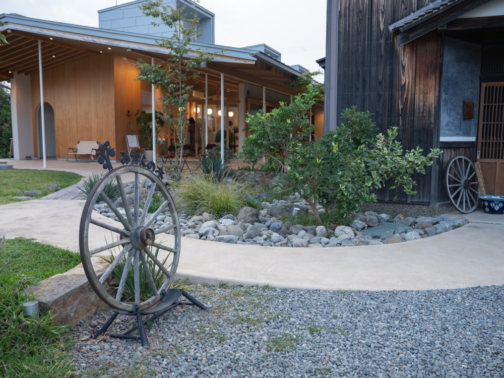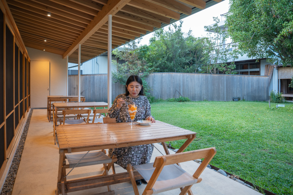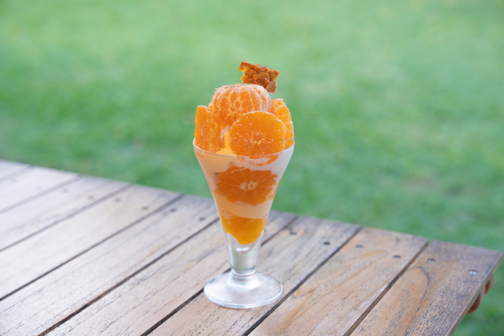 2024(令和6)年に、もともと事務所や店舗があり、みかん畑に囲まれた敷地の一角にカフェがオープンしたと噂で聞いて、楽しみにお伺いしてきました。みかんの木はもちろんのこと、和歌山ゆかりの木や植物を植栽する庭の中。和歌山の木材を使った、ゆったりと開放的な建物で、食事やデザート、みかんジュースを味わうことができます。