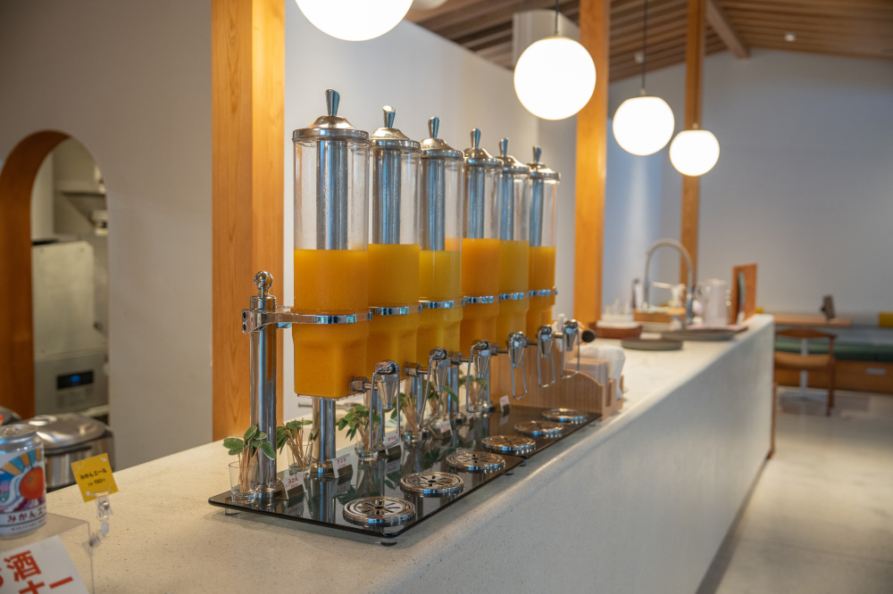 メニューの特徴は、全てに柑橘を使用していること。できうる限り、和歌山の農産物や海産物を取り入れていること。大胆に柑橘の輪切りをはさんだハンバーガーや、旬の柑橘と和歌山・黒沢牧場のミルクアイスを合わせた「みかんのプレミアムパフェ」は大人気。その時期におすすめの柑橘ジュース6種類から、自分で選んだ3種を飲み比べできる「100%ピュアジュース~3種飲み比べ~」は、ジュースサーバーから自分でカップに注ぐことができるのも嬉しい限りです。