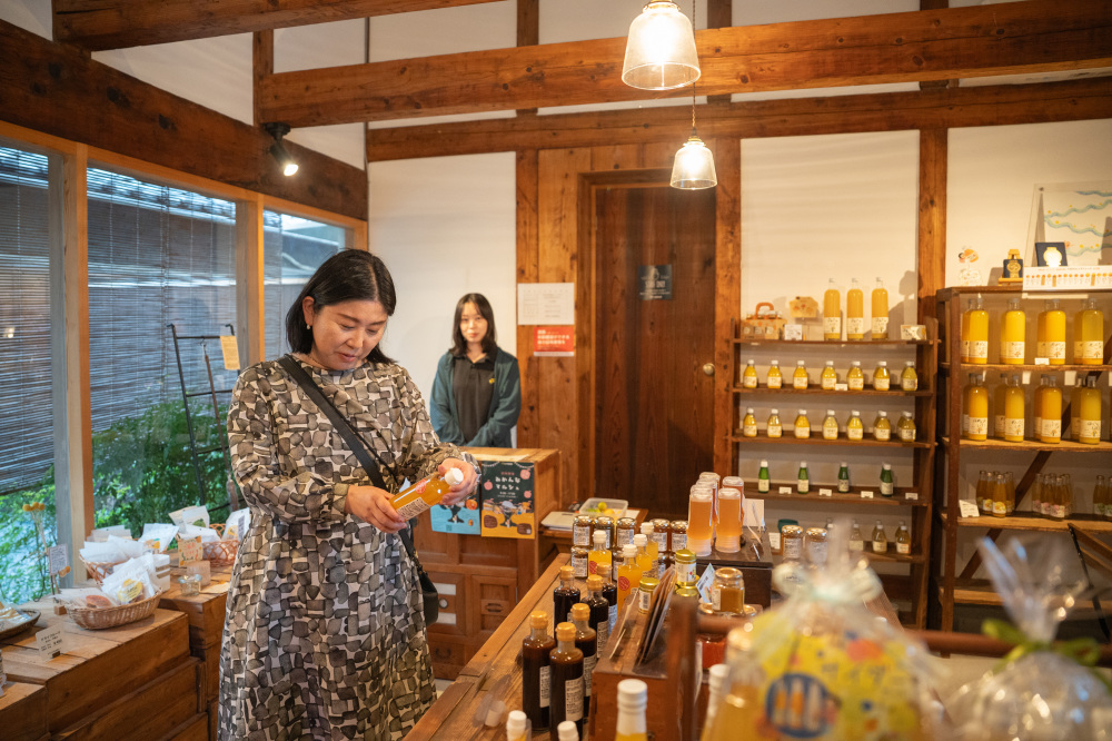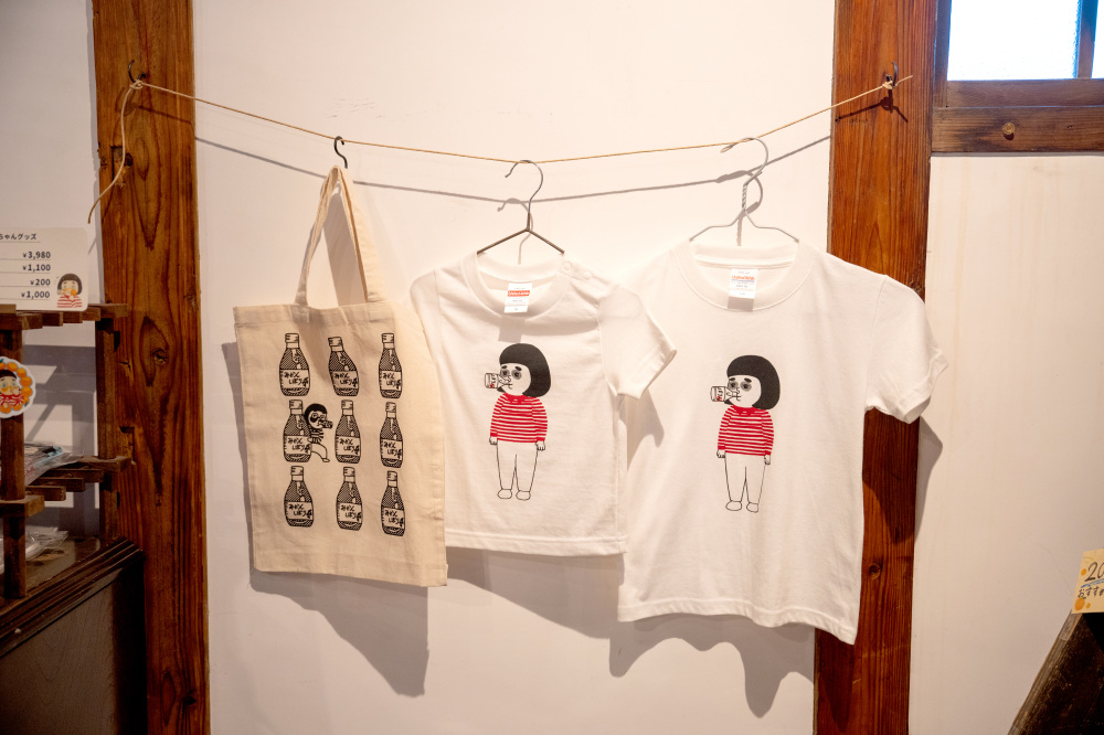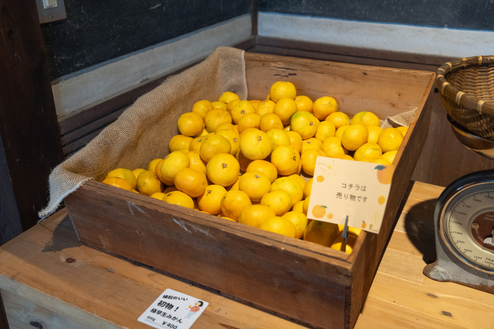 「ショップみかんの木」では、おみやげ選び。中でも気になったのが、伊藤農園のイメージキャラクター「きくちゃん」をデザインしたオリジナルグッズ。きくちゃんは赤いボーダーのトップスを着ていますが、そういえばカフェのスタッフも赤いボーダー姿。「きくちゃんは、5~6歳の女の子。みかんしぼりが大好物でいつも飲んでいます。菊みかんはご存知ですか?みかんの中でも、外皮がぼこぼこしたものを指す通称。あまり見た目はよくないですが、地元では甘くておいしいみかんとして知られています。きくちゃんの名前はそんな菊みかんからもらってます」と教えていただきました。