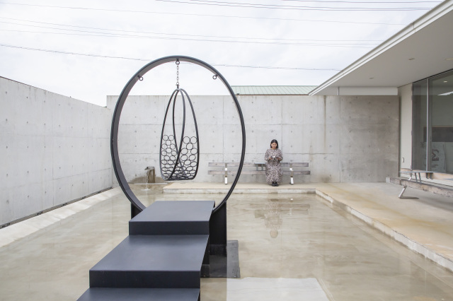 水盤を設えた中庭のベンチに腰かけ、その場でお菓子を味わうこともできます。本当はショーケースの中のケーキ全て食べたかったけれど、この日は和歌山の梅でほんのり酸味をつけたバニラのムースをエディブルフラワーで飾りつけた「ダ・カーポ」を選びました。敷地内には、完全予約制で夜の時間帯のみ営業のカフェも2024(令和6)年にオープン。夜カフェで提供される美しいパフェを味わうために、あらためて有田を訪れようと心に誓いました。