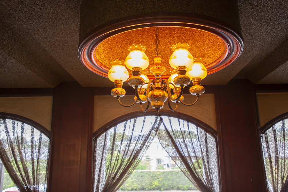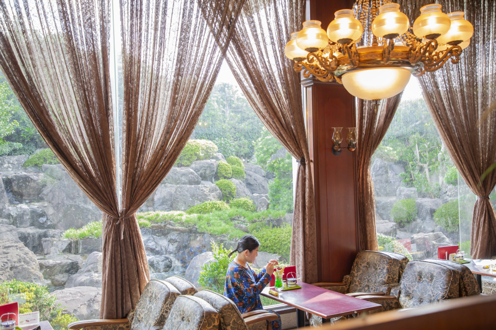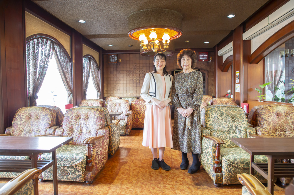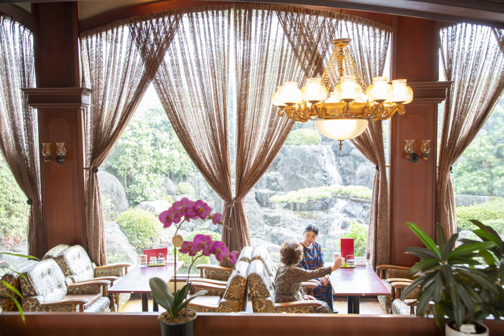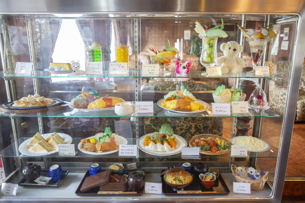 「もともとは10席ほどの小さな喫茶店からスタートしたのですが、同じように国道沿いにあった他の喫茶店がどんどん大型化して豪華になって。それでうちも1979年(昭和54年)に周囲に負けじと、今の店を建てました。ただ広いだけじゃ芸がないと。お庭で滝を流すことにしたんです」。ゆったり腰が沈む椅子は補修しながら使い続け、ガラスケースの中の食品サンプルも昔のまま。「昔の喫茶店は、ムード出すために暗かったでしょ。それをうちは窓や庭を大きくとって明るくしました。そしたらお料理が暗がりで食べるよりおいしくなる」と稔美さん。