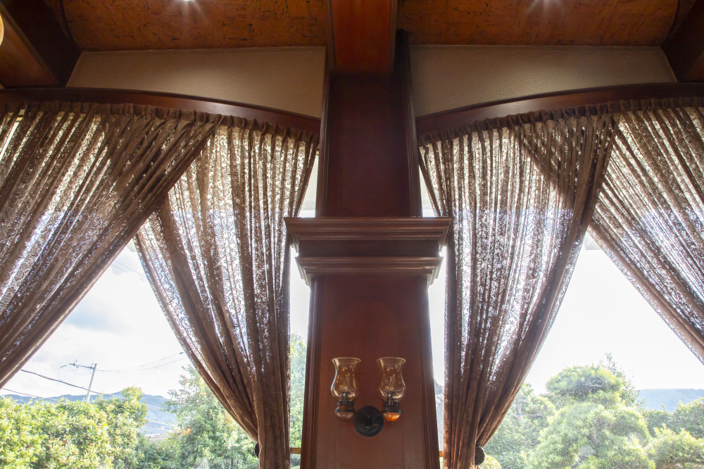 大阪のリーガロイヤルホテルのロビーを思わせる、天井を高くとった豪奢な店内。大きな窓の外には、大きな石の間から滝が流れ、悠々と錦鯉が泳ぐ庭園が広がっています。オーナーの笹田稔美(なるみ)さんと、娘の宮本美和子さんに、「店名の“サンスイ”は“山水”が由来ですか?」と尋ねると、音楽喫茶として始めた当初に設置した音響機材メーカーから名付けたのだと教えてくださいました