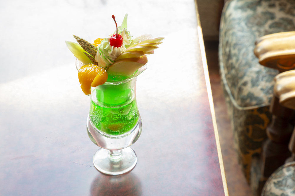 この日注文したのは、常連客にはフルポンと略される「フルーツポンチ」。容器は、昭和の時代に製造されていた貴重な二重式のグラス。美しくカットされたフルーツが盛り付けられた様が、華やかな衣装に身を包んだアイドルのようにとびきりの愛らしさ。昔は二重グラスの外側に、ドライアイスを入れていた時代もあったそう。