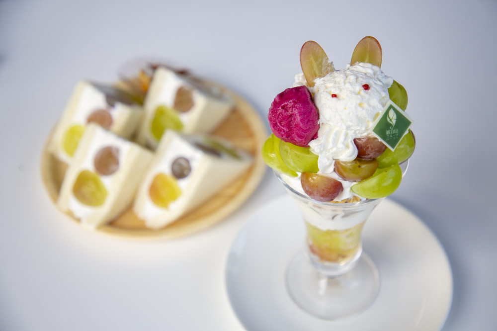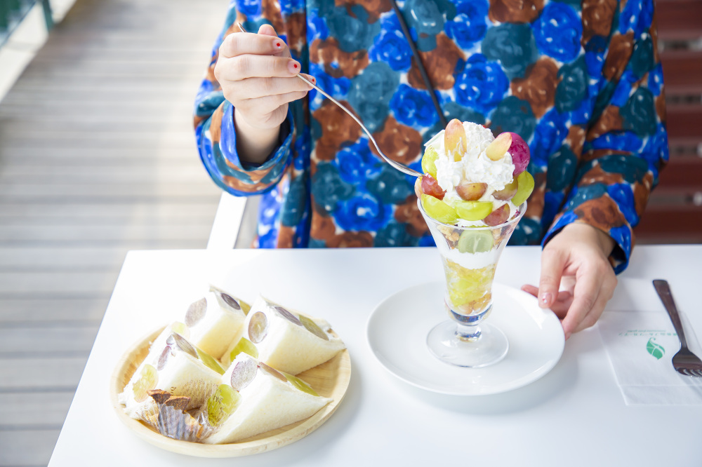 メニューには、柑橘類だけでなく、いちご、もも、ぶどう、さくらんぼ、柿、栗、梨と、そのときどき旬のフルーツが。種類も、パフェ、サンドイッチ、ソフトクリーム、ドリンク、生フルーツ、ハンバーガー、アフタヌーンティーセット(平日限定)と多様。秋に訪れた際には、中秋の名月をイメージして、てっぺんにホイップクリームのうさぎをのせた、ぶどう尽くしの秋限定「和歌山県産豊艶ぶどうパフェ」と、自家製クリームをふんだんに使った「旬のぶどう農園サンド」を頬張りました。売店では、ジャムやジュース、ドライフルーツやもぎたてのフルーツも販売。和歌山みやげに喜ばれます。