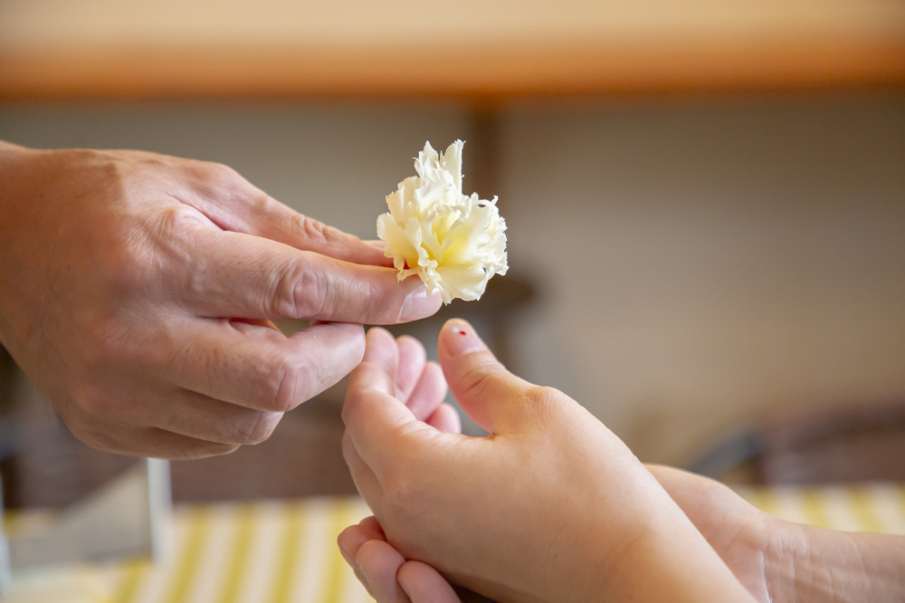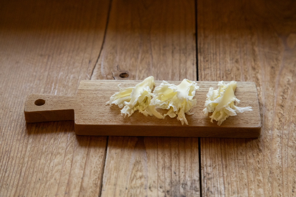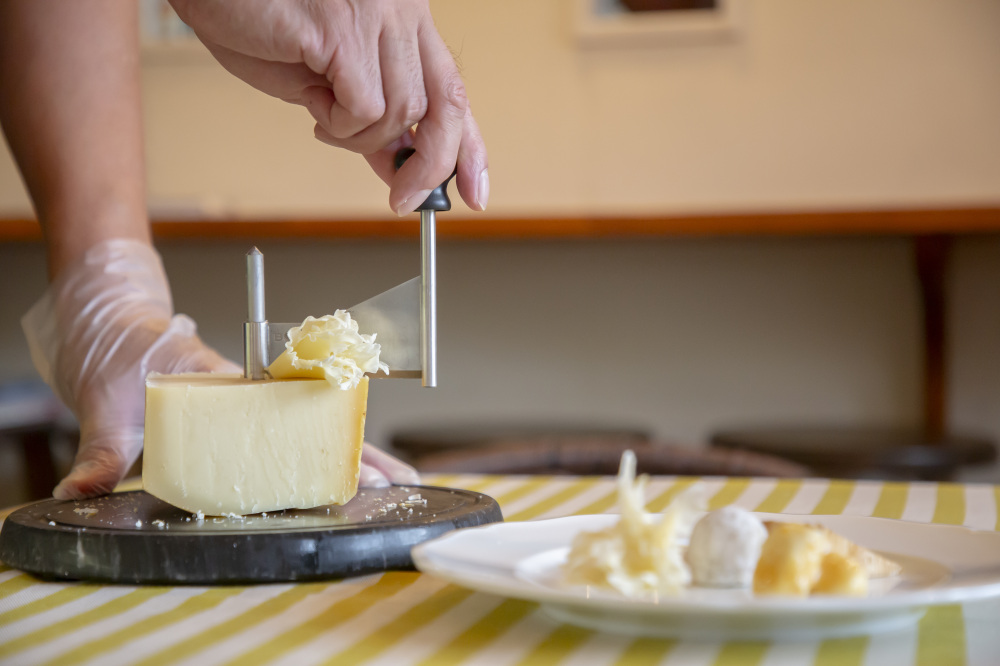 以前はお酒が飲めなかったという喜臣さん。ワインが好きな妻の智子さんとの出会いをきっかけに、二人でワイナリーやワインバーを訪れるようになったそう。そうして器具をくるくる回して、お花みたいに削るチーズ「テット・ド・モワンヌ」を知ることに。