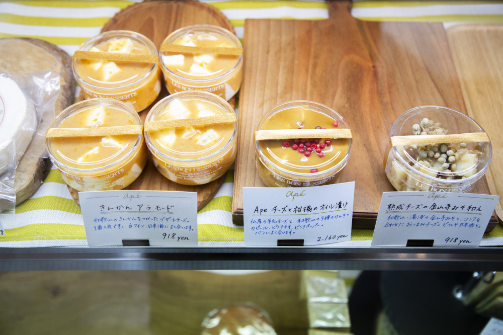 迷ったらまずはオリジナルのチーズを。和歌山の地酒「黒牛」に合うチーズをと開発されたデザートチーズ「Apeきんかんアラモード」はじめ、「Ape熟成チーズの金山寺味噌和え」「カマンベール燻製湯浅しょうゆ風味」「Ape柿のフロマージュトリュフ」と、どれも和歌山ならではで、他にない豊かな味わい。和歌山みやげとしてはもちろんですが、国内外のソムリエやシェフからも注目を集める宮本さんが生み出す味を楽しめます。