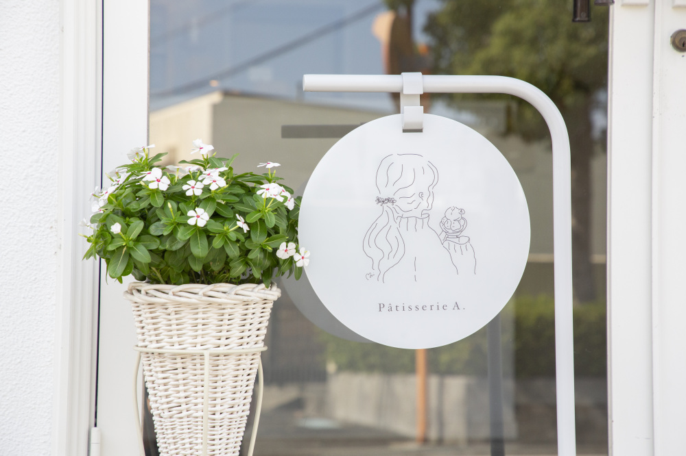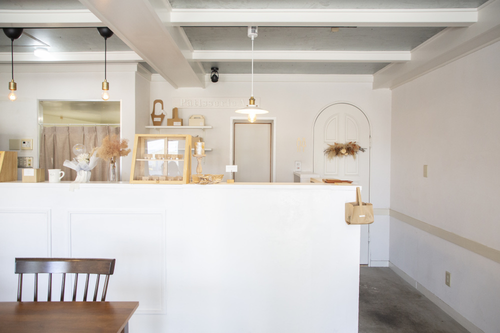 こじんまりと愛らしい白壁の店内に、色とりどりの旬のフルーツを使ったタルトやシュークリームが映えるタルト専門店「パティスリー エー.」。オープンは2021(令和3)年。オーナーは、地元出身の鈴木和綸(あいり)さんで、店名の”エー”は和綸さんのイニシャルから。