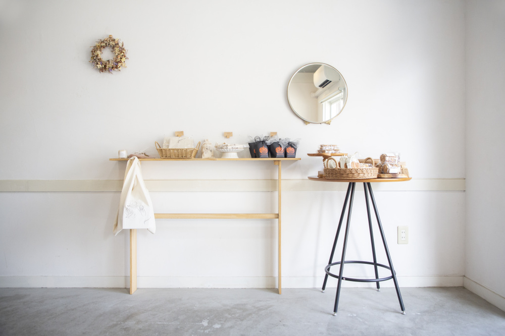 テイクアウトする人が多い中、3席のみの客席でイートインも可能。カップやお皿、カトラリーにいたるまでチャーミング。ドリンクメニューは、アールグレイ、アサイージュース、リンゴジュース、はっさくのジュースなど。タルトはこぶりなので、2~3個選んで、一人で食べる人も。お土産に遠方へ持ち歩きたいときは、鈴木さんの先輩が描いたイラストをあしらった、テイクアウト用の袋や箱に詰めてもらって、焼き菓子をどうぞ。