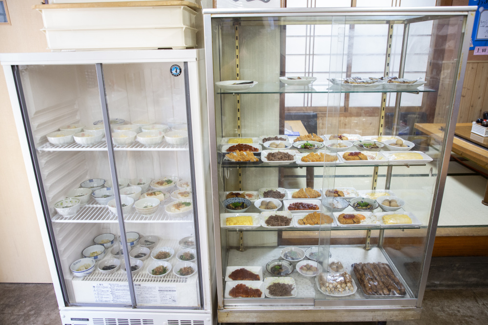ショーケースには、目玉焼きに卵焼き、ポテサラ、おひたし、煮物、揚げ物、ハンバーグ、漬物……お惣菜がずらり。もちろん全て手作りです。ピンク色の短冊には、一番人気の「やきめし」の他にも、「肉うどん」「中華そば」「親子丼」、水曜日限定の「カレーライス」も。