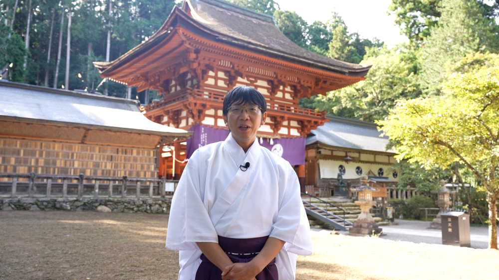 丹生都比売神社 神職の藤野さん。「弘法大師・空海が真言密教の根本道場を開いた際に、この神社のご祭神である丹生都比売大神から神領であった高野山を授かったことからこの神社は高野山の総鎮守とされています。」