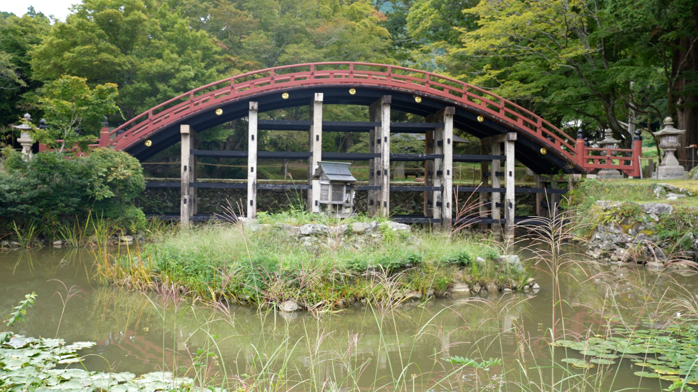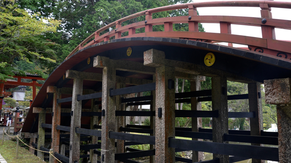 丹生都比売神社の鳥居をくぐってすぐ、神域の入り口にかかる輪橋(太鼓橋) 。「伝承によれば、豊臣秀吉の側室の淀殿が奉納したと言われてます。現在も石の土台は淀殿が奉納したものが今も使われています。」