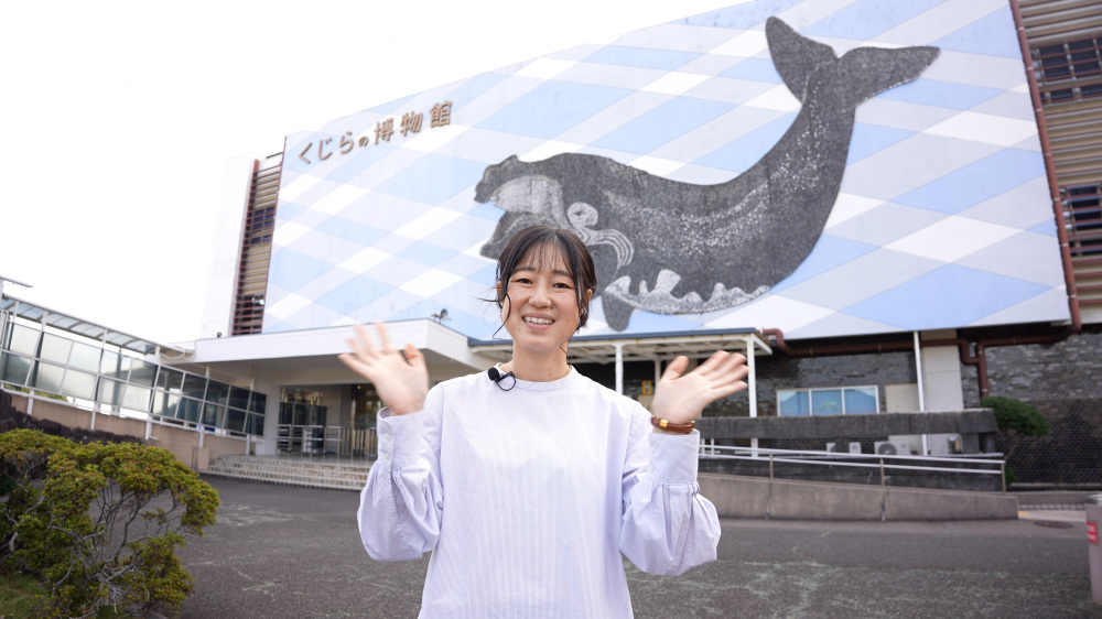 くじらの博物館の広報担当・飯塚さん。「キャッチフレーズは『触れて、感じて、見て、学ぶ』です。かわいいクジラやイルカに癒やされるだけでなく、本物に触れることで、これからの私たちと生き物の関わりについて考えるきっかけにしていただければ嬉しいです。」