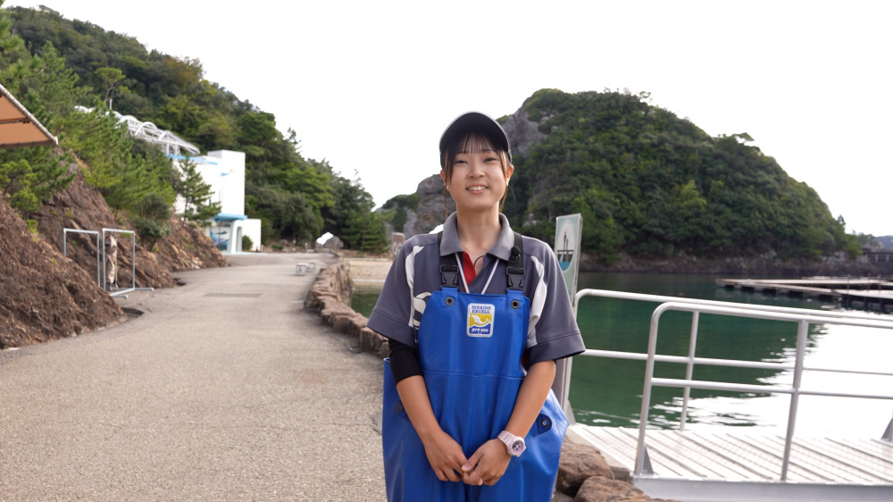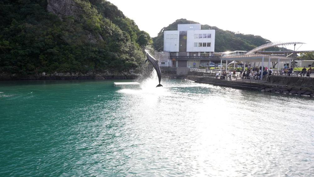 「クジラショーステージは、自然の入り江そのものです。ショーでは頭が丸いのが特徴の『オキゴンドウ』や『ハナゴンドウ』が登場します。同じタイプに見えますが、体の大きさも性格もそれぞれ違うんですよ。」